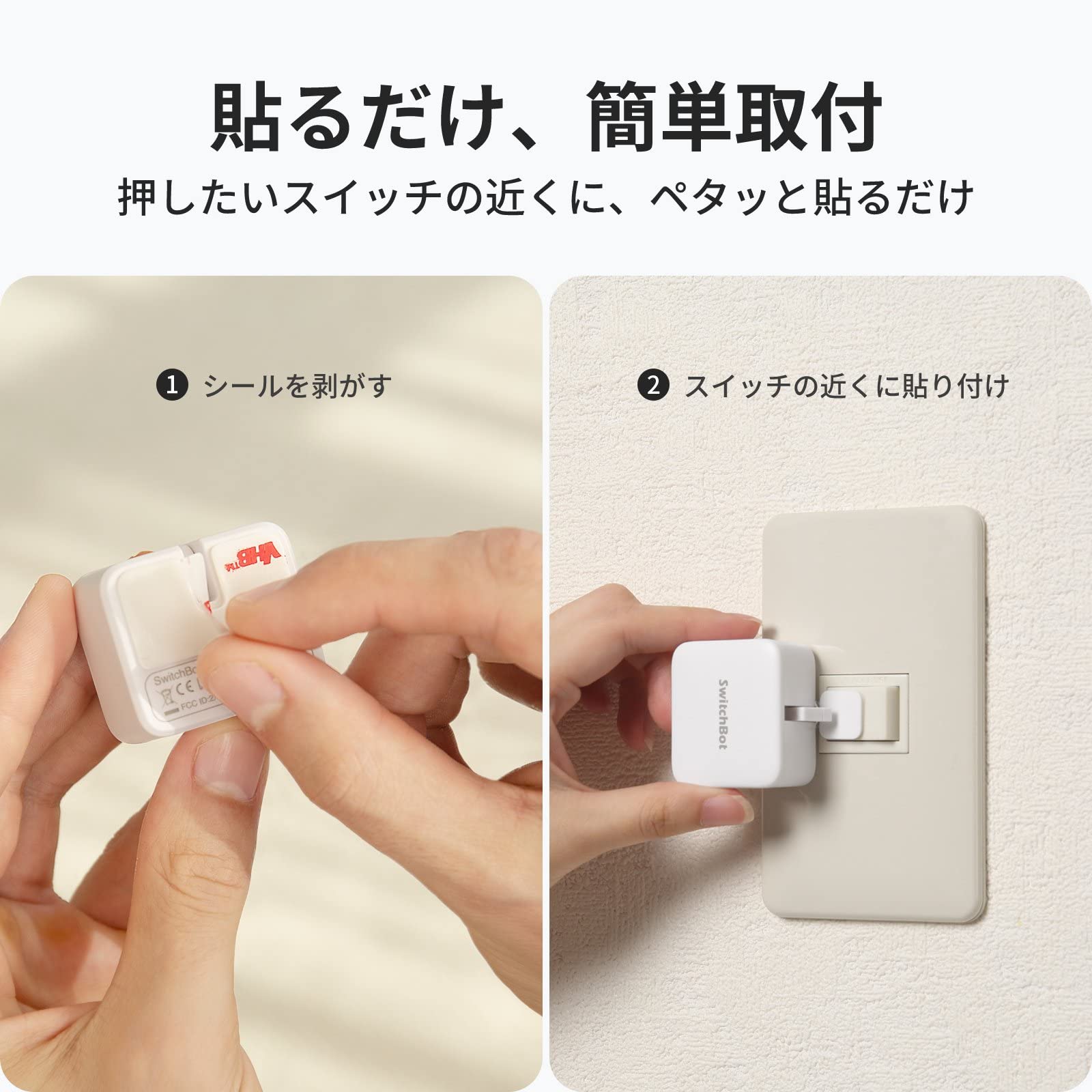 【3分で設置完了、取付カンタン】 SwitchBotアプリにて数分程度の登録作業を済ませて、本体背後のシールを剥がし、スイッチの横に取り付けて、すぐに使えます!IoTデバイスの初心者様もOKです。