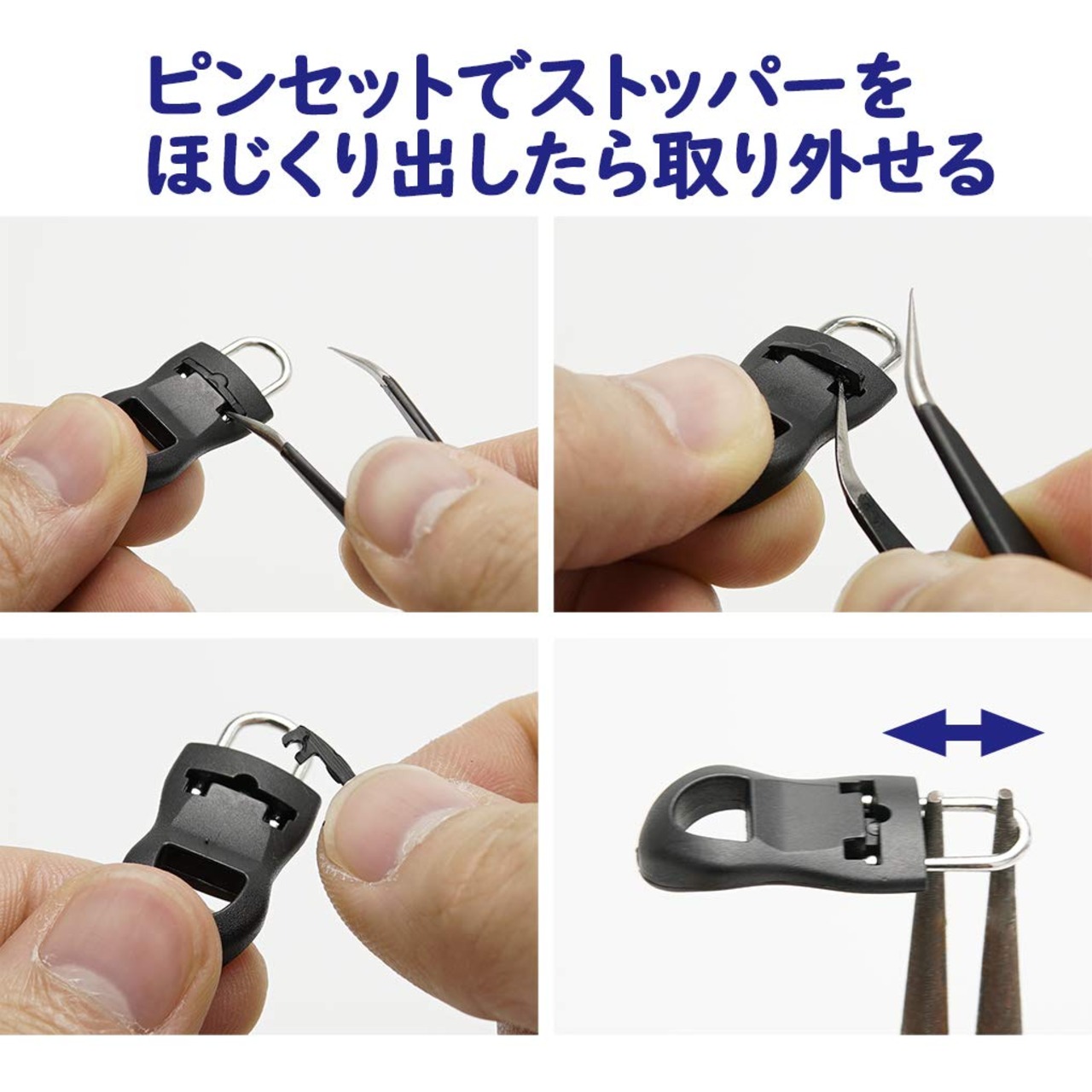 U字タイプ:U字リングピンを底まで差し込んで、ストッパーをラジオペンチで挟んで押し込んだらOK!持ち手が大きくて開閉しやすい、修理するものに合わせて使い分けられる大小セット。