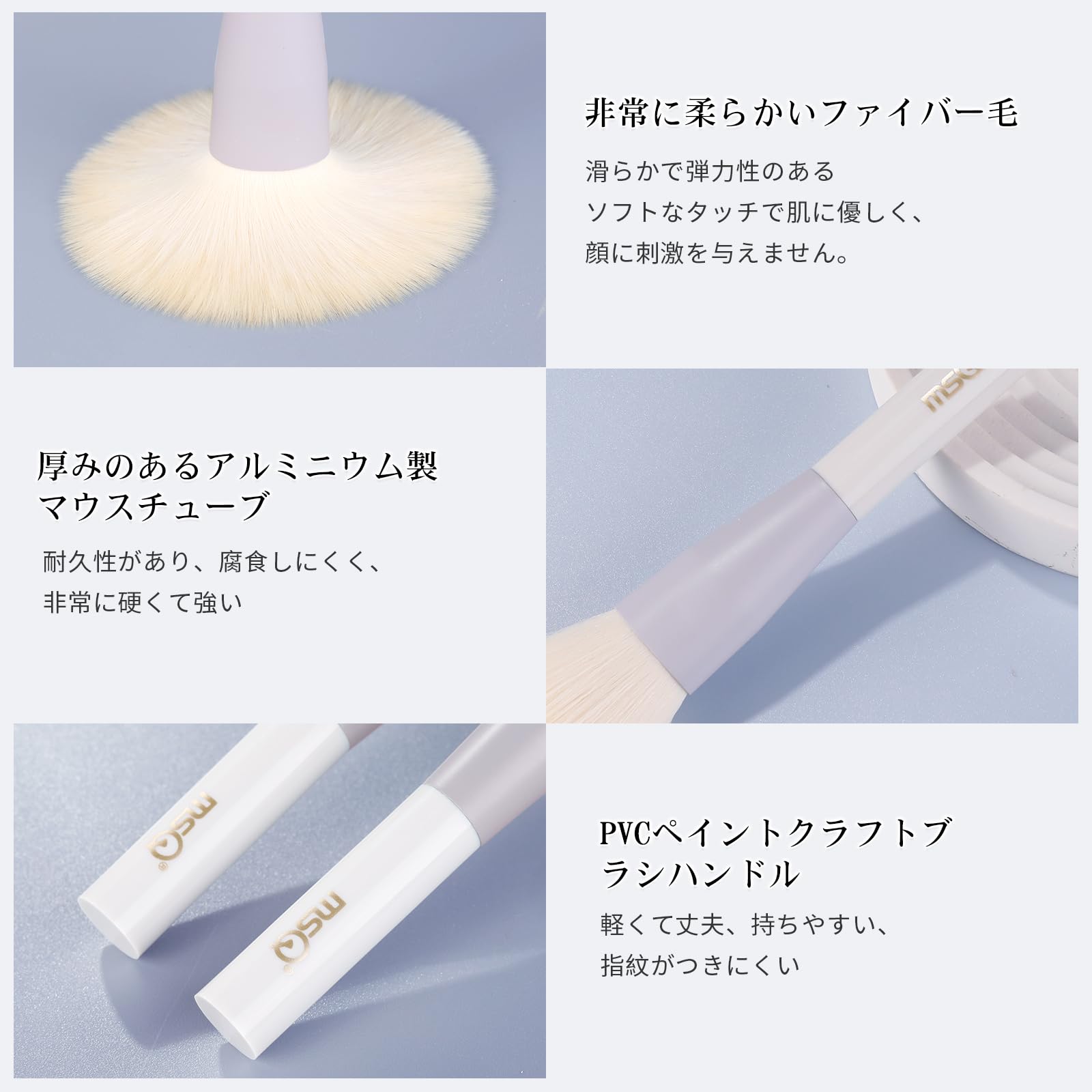 【心地よい感触】品質にこだわり、タクロン100%・天然木を使用。 天然毛とは異なり、肌に触れた瞬間から刺激が少なく、驚くほど柔らかな感触をお楽しみいただけます。 動物アレルギーや敏感肌の方にも安心です。 優れたキープ力と心地よいテクスチャーで、メイクのノリをさらに高めます。