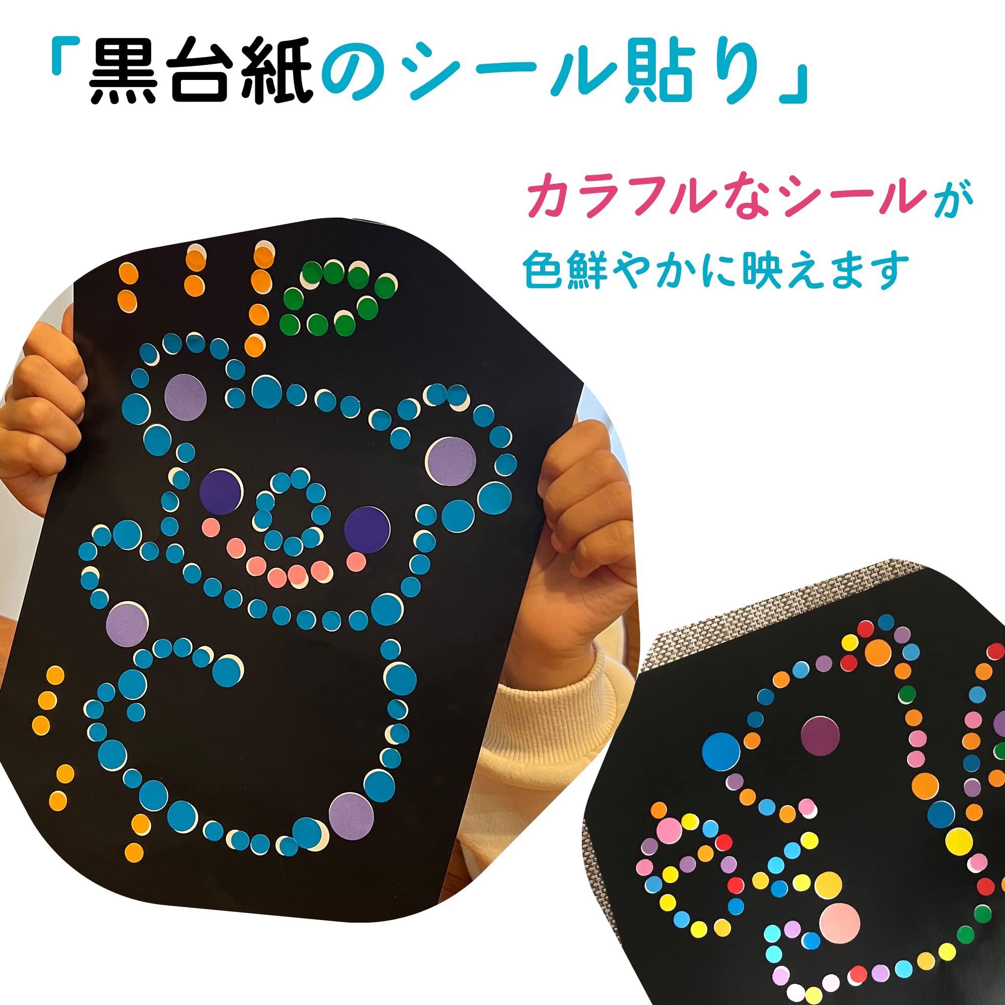 【たのしくシール遊び】 台紙が黒一色になっているため、カラフルな丸シールがより目立ちます。お好みでカラーペンを使用してイラストを描き加えるのもおすすめ。
