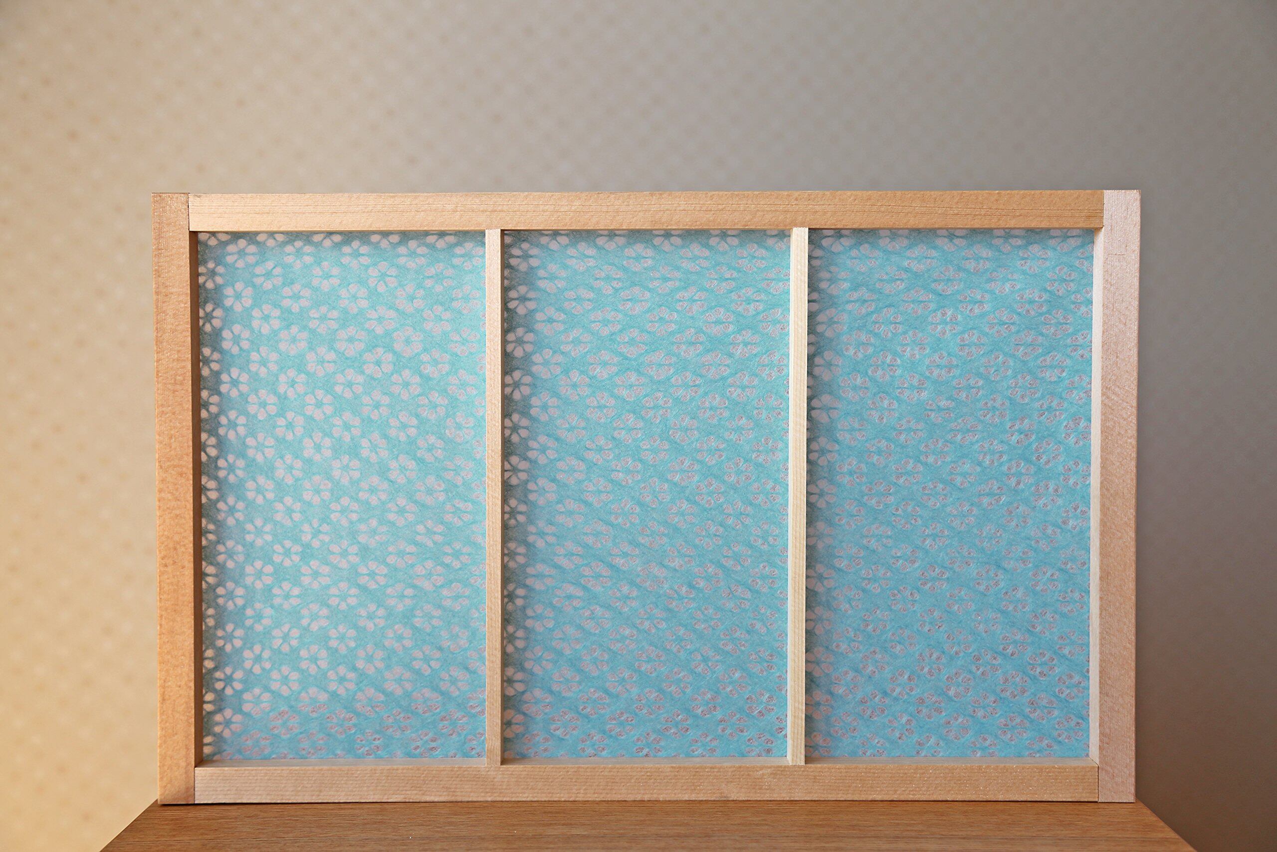 ●日本の伝統柄である麻の葉紋様を前面に付けた障子紙。障子紙工房は小梅柄もあり、部分的に張り替える事で、破れ補修にも使用できる