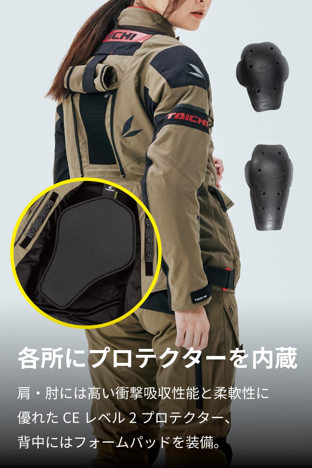 雨天走行時を快適にする防水透湿素材に加え、暑さをしのぐ大型ベンチレーションを両胸と背面に採用することで、全天候に対応するアドベンチャーコンセプトジャケット。全方向から視認できるリフレクター(反射材)と肩・肘のCE Lv.2プロテクターにより高い保護性を確保しています。前面に2ヶ所、背面に1ヶ所防水ポケットを装備。手荷物を収納して身軽な状態でのライディングが可能。胸部プロテクター(別売り)を装着するためのアタッチメントを装備。スナップボタンで胸部プロテクターの着脱が可能です。(CPS対応)TAICHIのジャケットであれば装着可能。背中のプロテクターはCE Lv.2プロテクター(別売り)にてアップグレードが可能。