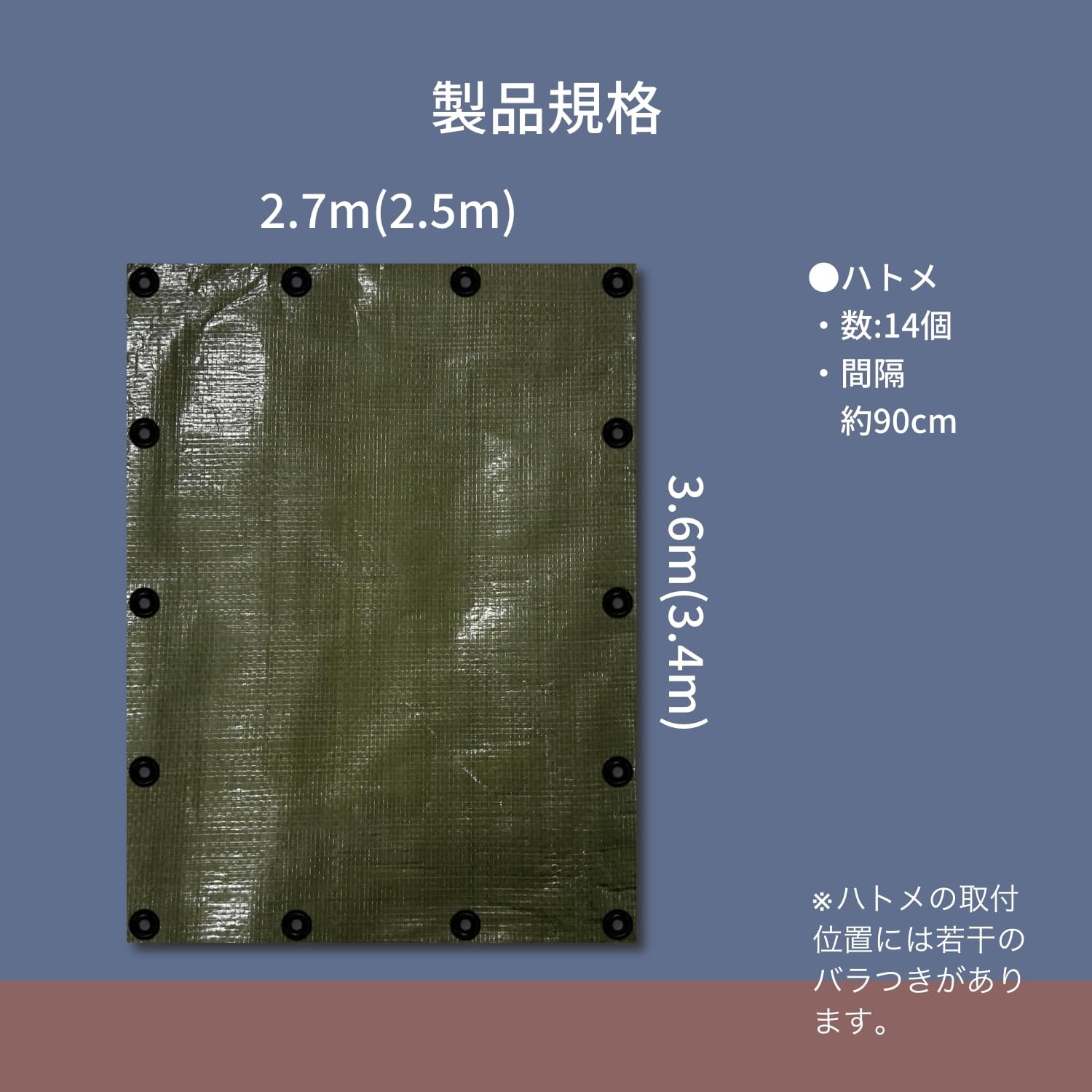●ハトメ数(個):14●ハトメピッチ(cm):90●幅×長さ(m):2.7×3.6●質量(kg):1.5