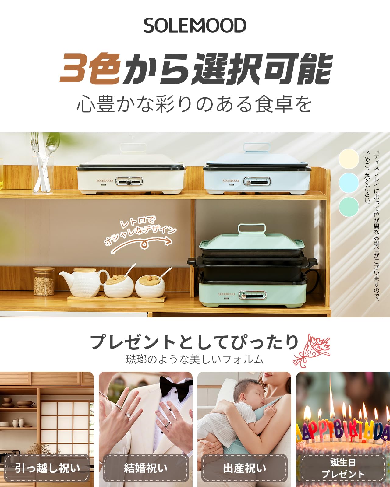 SOLEMOOD コンパクトホットプレート グリル鍋 着脱式プレート 温度調節機能付き 洗いやすい おしゃれ かわいい 1000W高出力 プレート選択可能 1~4人用 小型 ひとり暮らし にも (プレート3種(平面・たこ焼き・鍋)-ホワイト)