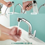 【2つの水流モード】ヘッドの先端を回転すると、泡沫整流とシャワーを切り替えが可能。水を汲んだり集中して使いたい場合は、整流を切り替える。髪を洗う時はシャワーモードに切り替えます。