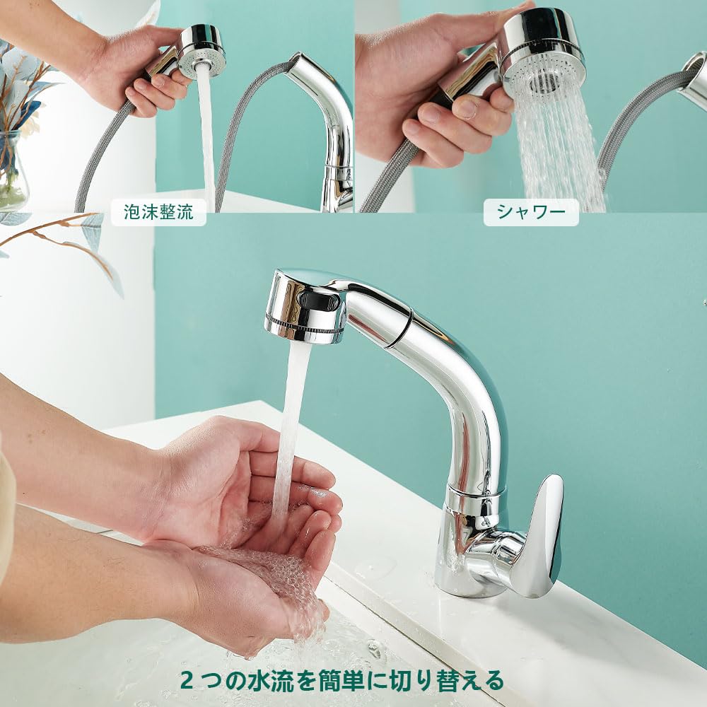 【ホース引き出し式】洗面水栓のホースは最長50 cm引き出し可能です,洗髪、洗面台をお掃除、場合はにはとても便利です。レバーひとつで水量と温度を調節でき、お年寄りからお子様までどなたでもご使用いただけます。