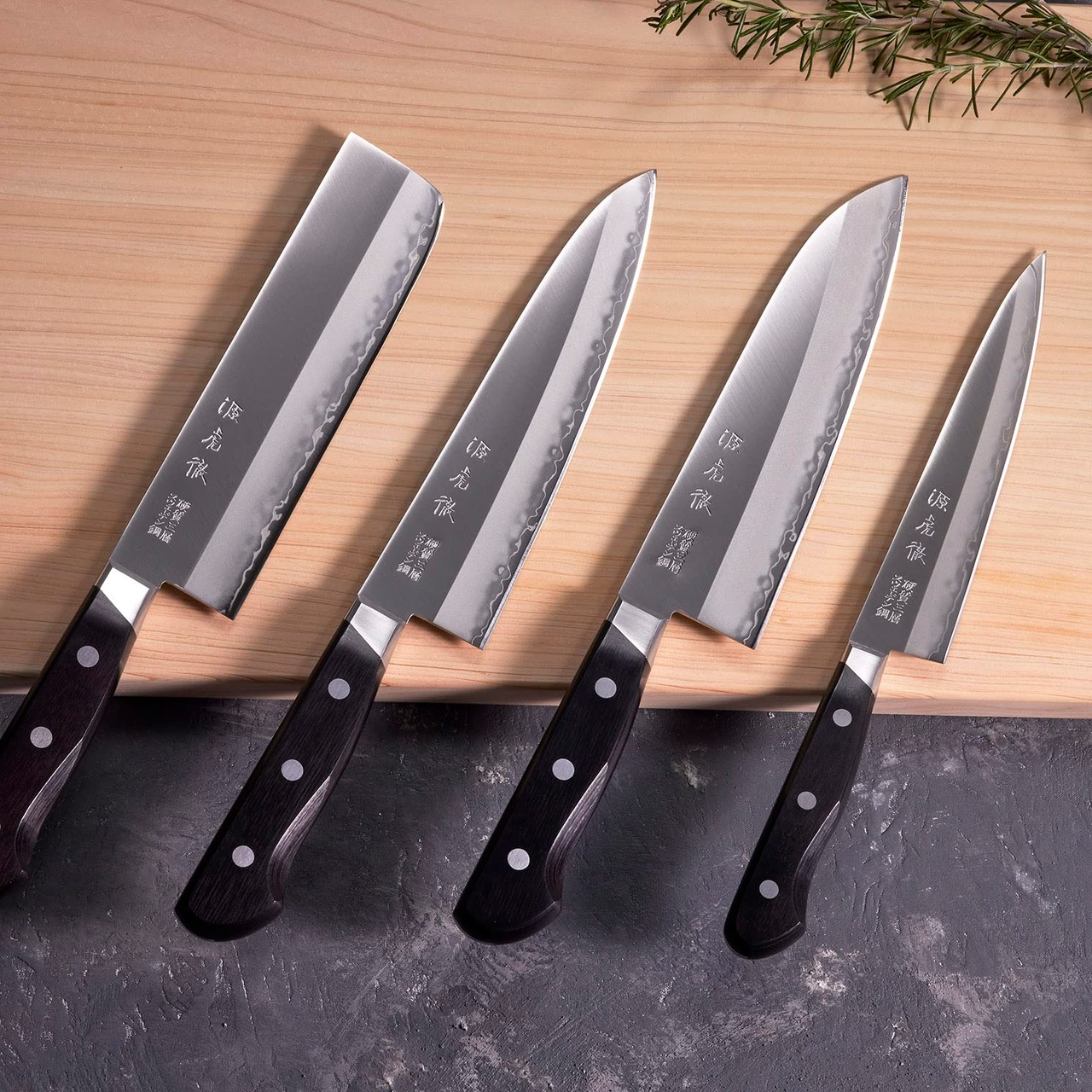 ●【源虎徹】。源虎徹は800年の歴史と伝統ある刃物の町、岐阜県関市で選び抜かれた素材と伝統技術によって生まれた逸品。世界的に有名な特殊鋼の産地スウェーデン生まれの高級刃物鋼(19C27鋼)を、三層鋼(割り込鋼)に鍛え上げ、熟練された職人の手によって、一本一本高度な熱処理と丁寧な研ぎ上げ、精魂こめた保田式本刃付けをほどこしてあるので、刃身は硬く、錆びには強い、粘りのある鋭い切れ味が特長