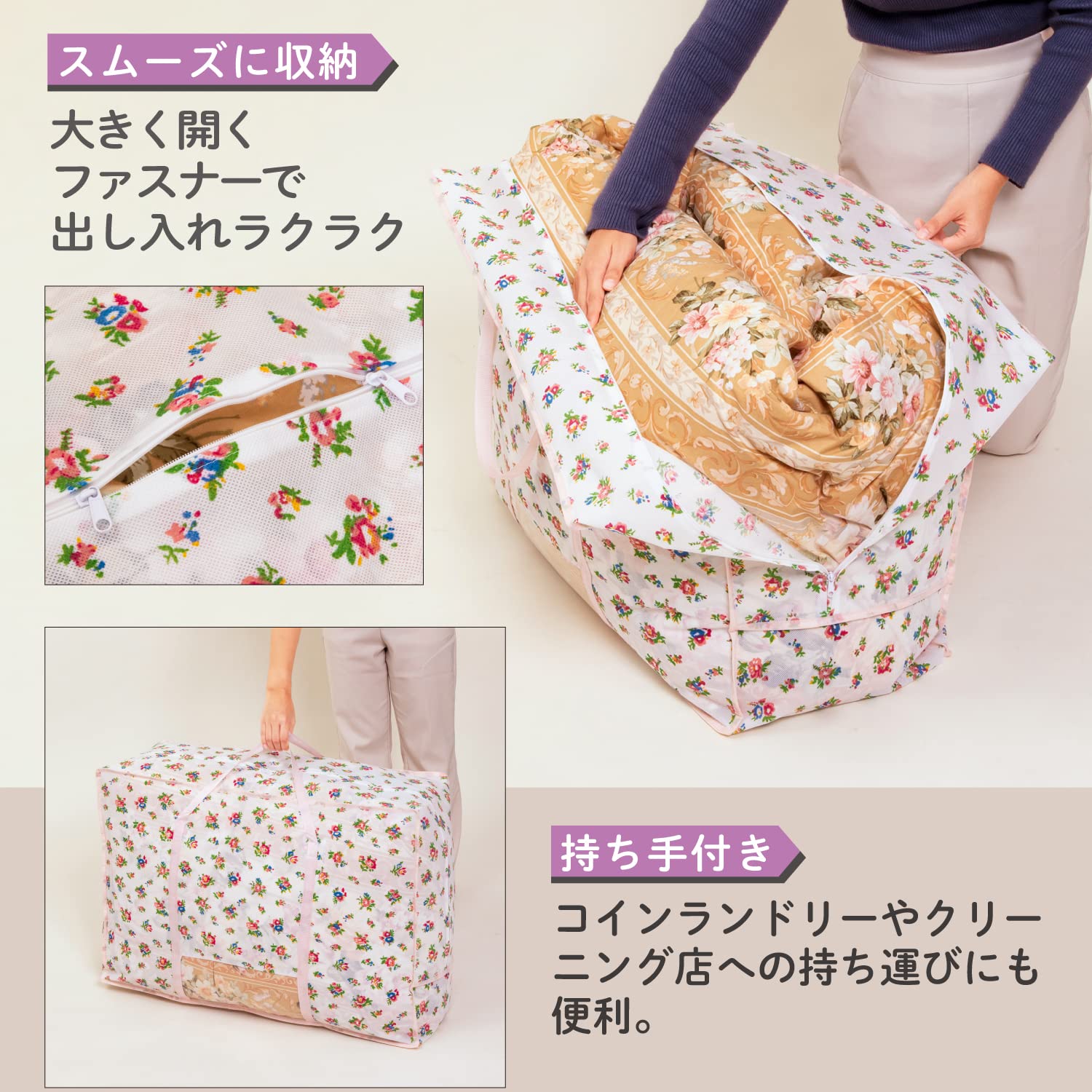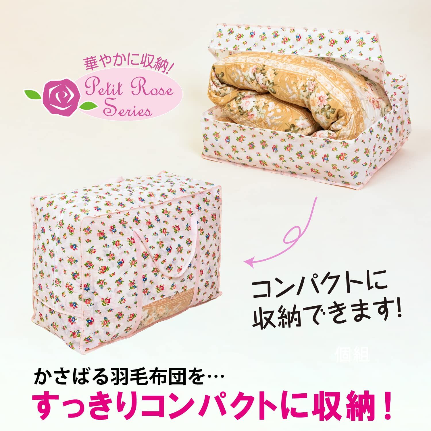 アストロ 収納ケース 羽毛布団用 シングルサイズ・ダブルサイズ兼用 プチローズ柄 不織布 収納袋 縦置き 持ち手付き 183-25
