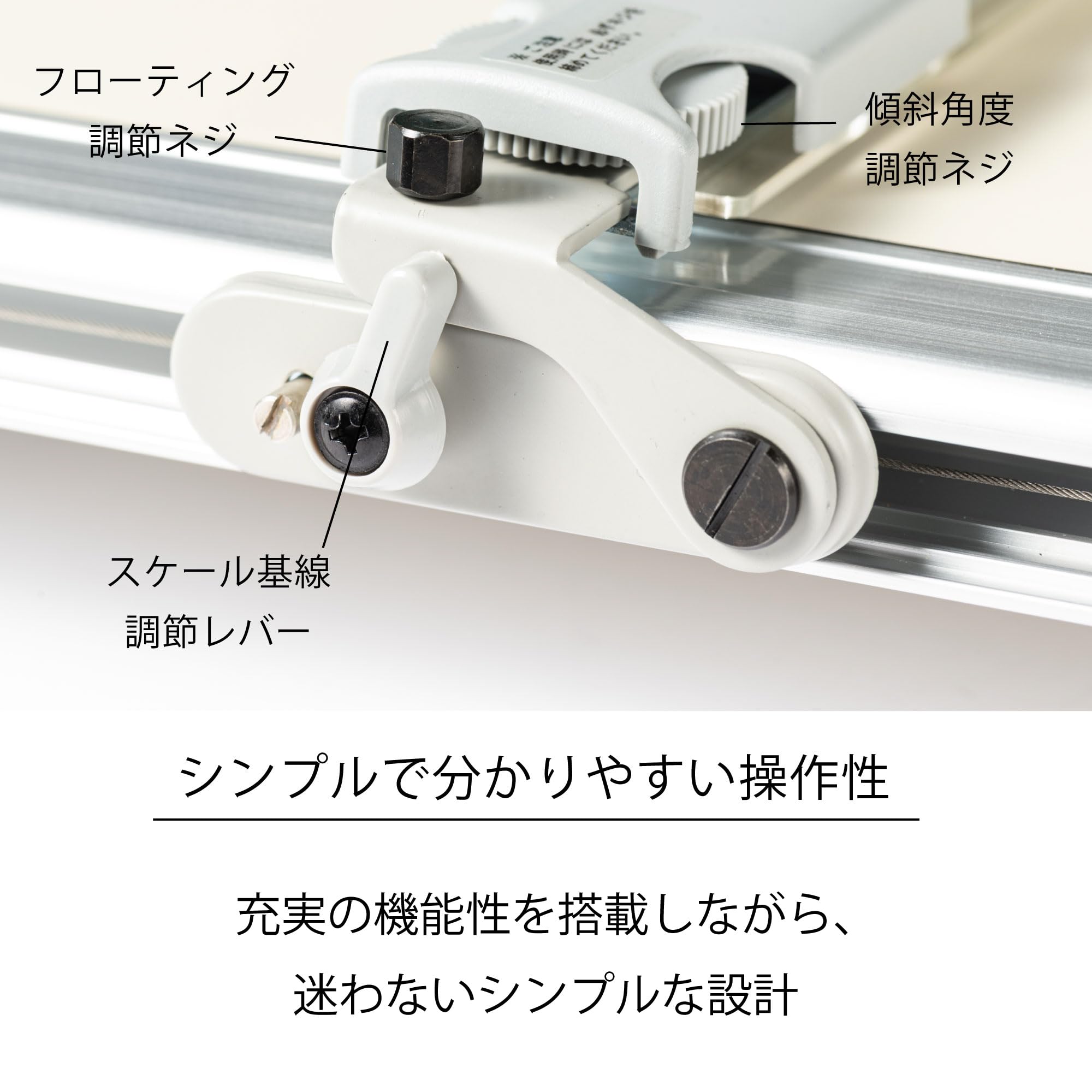 【小さいサイズの図面を引く際に便利な基準線調整機能を搭載】スケール左側のレバーを倒すとロックが解除され、約+-45mmの傾斜まで、基準線との角度を微調整できます。レバーを起こすと再びロックがかかります。学校の課題等で小さ目の図面を複数日に渡って引く際に便利です。※建築士試験会場でスケールを傾斜させて使用することはできません。会場では必ず水平な状態でご使用ください。