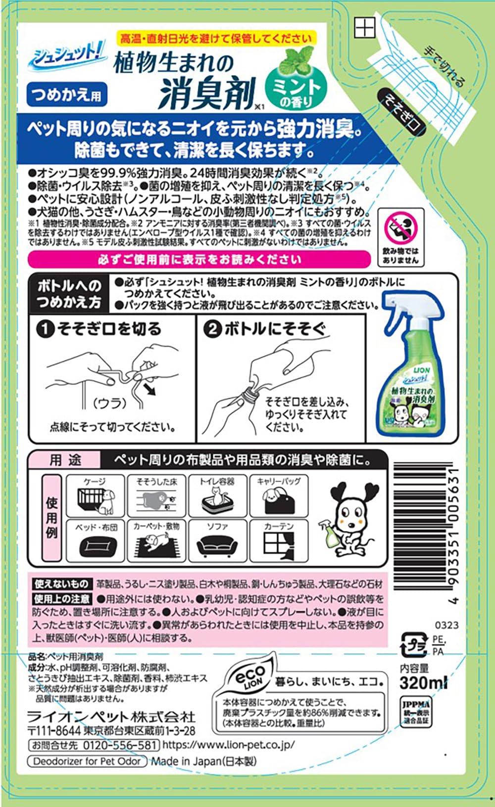 シュシュット! 植物生まれの消臭剤 ミントの香り つめかえ 320㎖ ライオンペット