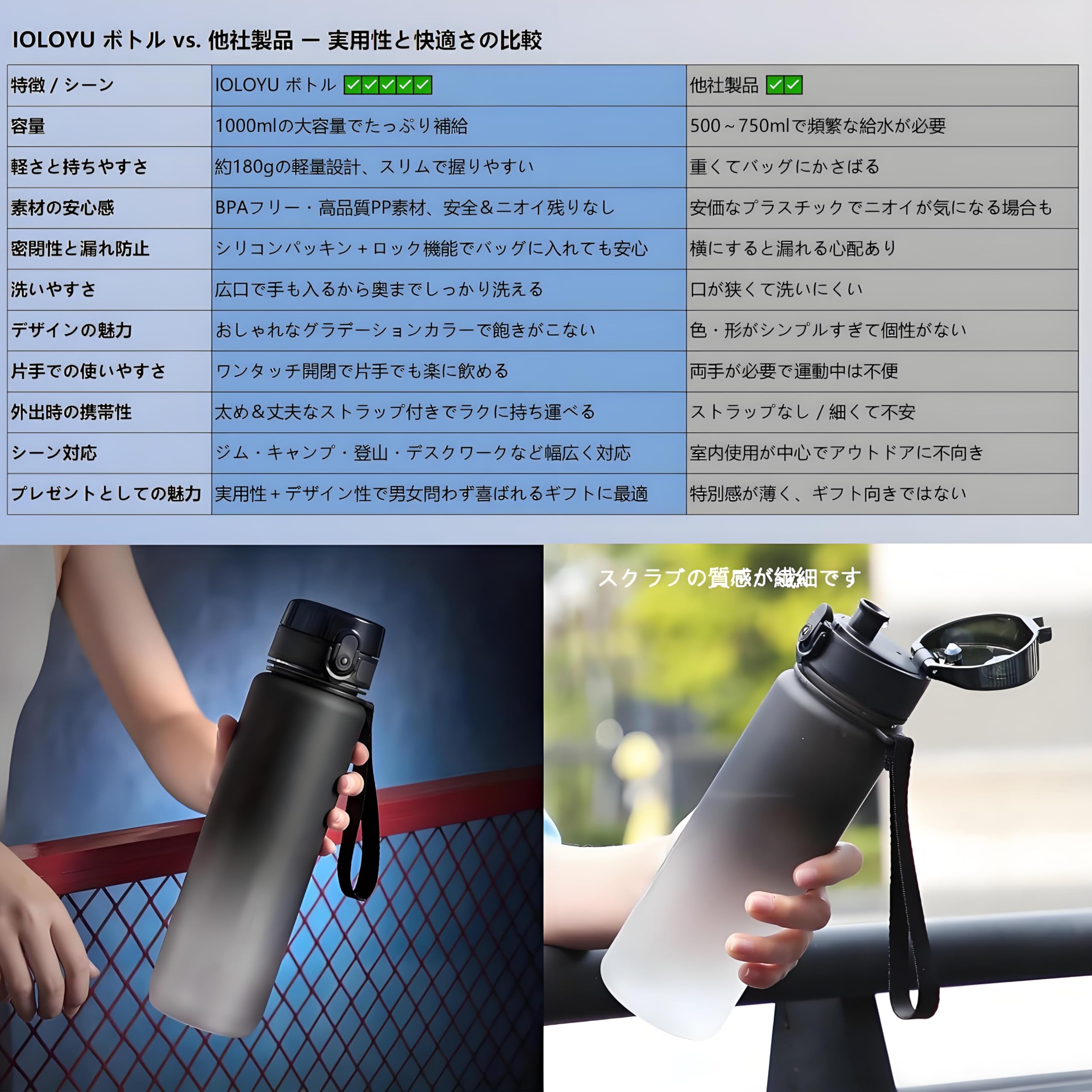 IOLOYU 水筒 1リットル ウォーターボトル 1000ml 大容量 洗いやすい おしゃれ でかい 軽量 スポーツボトル プラスチック bpaフリー 大きい 手を入れて洗える 軽い 登山 アウトドア water bottle 大きいサイズ 1l スポーツドリンク 水ボトル 片手で開けられる ジム 飲みやすい オシャレ 漏れ防止 携帯便利 キャンプ 水筒