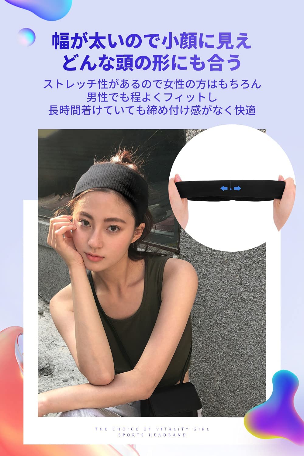 【高いフィット性でズレにくい】柔らかく伸びが有る素材を使用し、頭を優しく包み込んで、長時間着けていても締め付け感がなく快適。適度な伸縮性で、女性の方はもちろん、男性でも程よくフィットし、激しい動いてもズレにくい。また、幅が太いので小顔に見え、どんな頭の形にも合います。