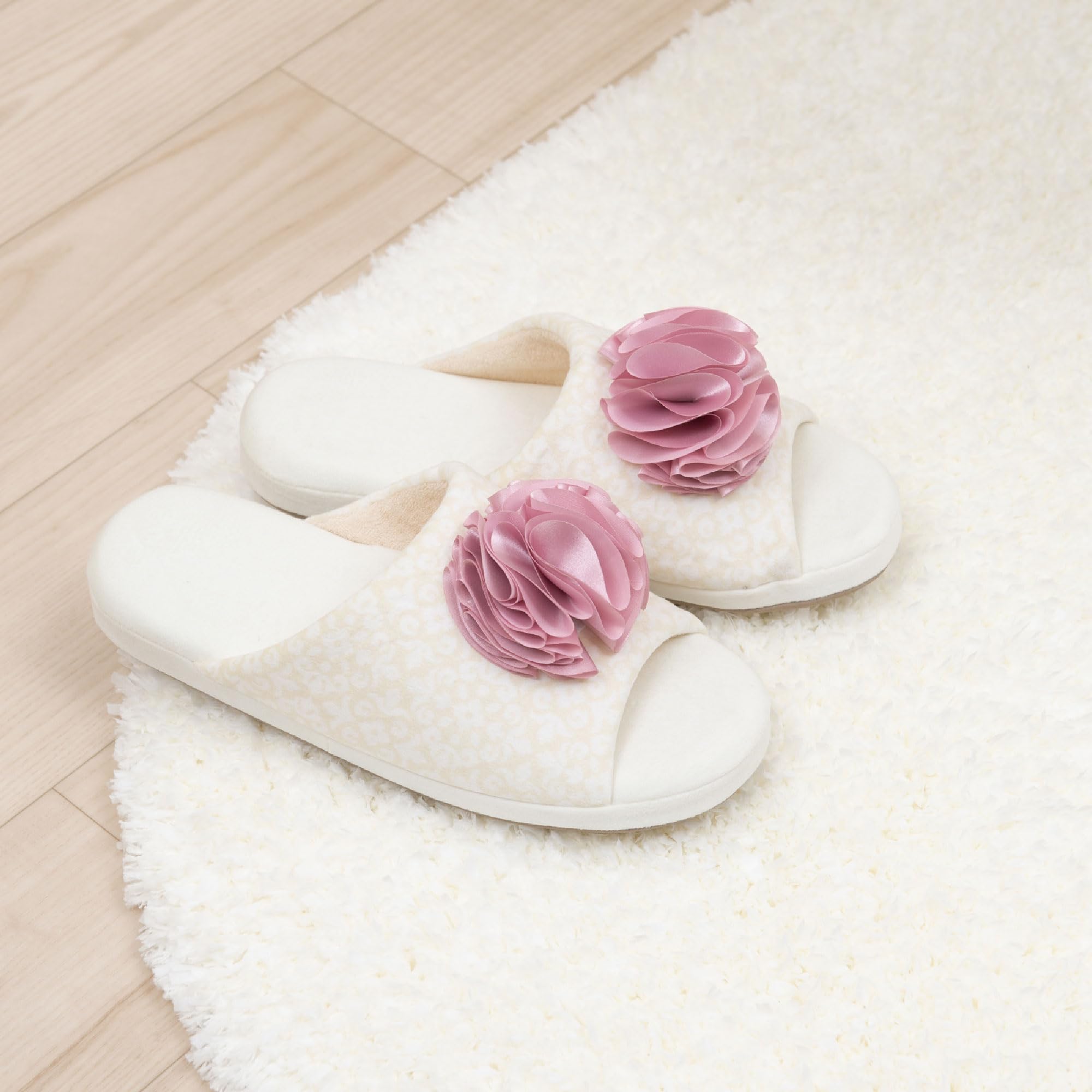 ふわふわポリエステルとスラリット糸をミックスした、砂糖菓子みたいなやさしい色合いのスリッパ。フリーサイズ(適応サイズ:約23.5~25.5cm)。サテンのコサージュがポイント、オーナメント柄の地模様でマットとコーディネートしていただけます。ウォッシャブル(タンブラー乾燥はできません)