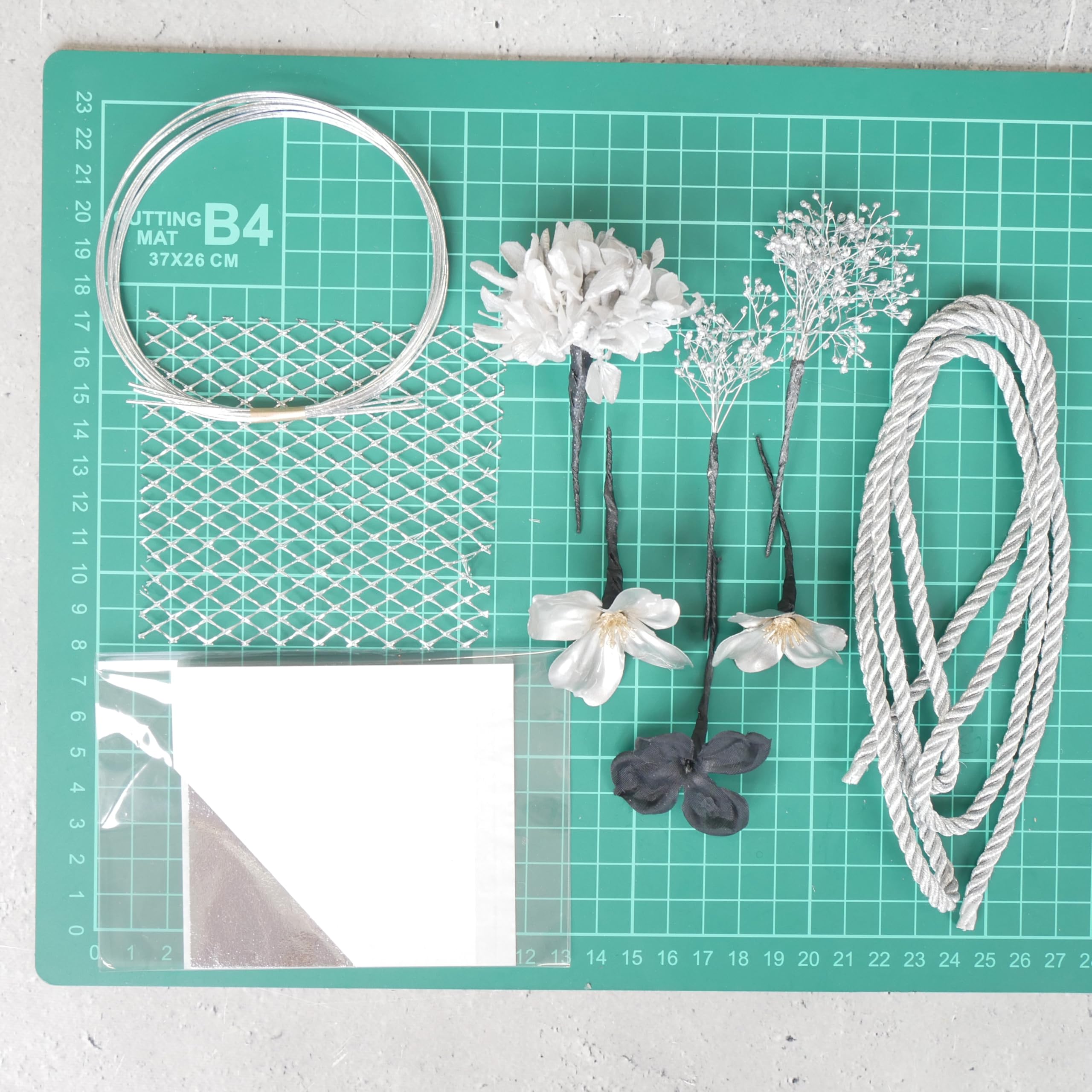 ︎パーツ詳細︎ 組紐 約130cm 1本 ドライフラワー 3パーツ 造花 3パーツ シルバーメッシュ 水引 シルバー3本 約90cm 銀箔シート