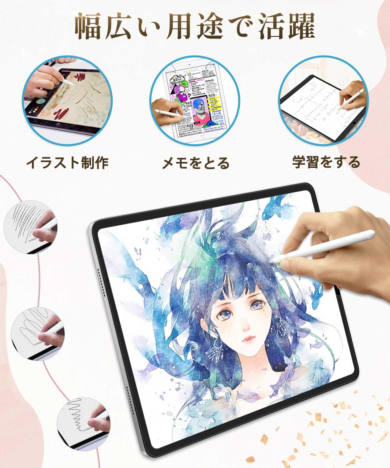 【紙のような描き心地】特殊表面加工により上質紙に鉛筆で描いたような描き心地を実現。 iPadで手書き作業をする人(ノート作成やイラスト)におすすめのペーパーライクフィルムです。️安い商品より圧倒的に書きやすい! さらさらした手触りで、書き味にこだわりたい方に最適です。また、表面を保護し、傷や汚れも防ぐ液晶保護フィルム(画面保護シート)です。