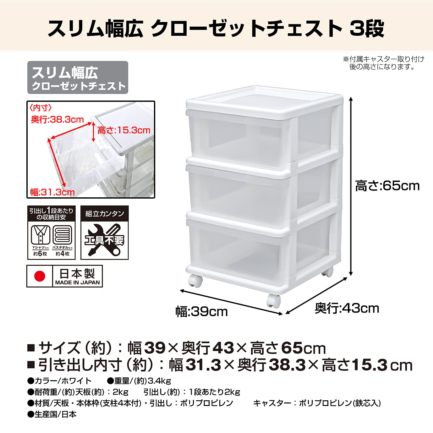 【 限定】 JEJアステージ(JEJ Astage) クローゼットチェスト3段 キャスター付 ホワイト/クリア 日本製 幅39×奥行43×高さ65cm