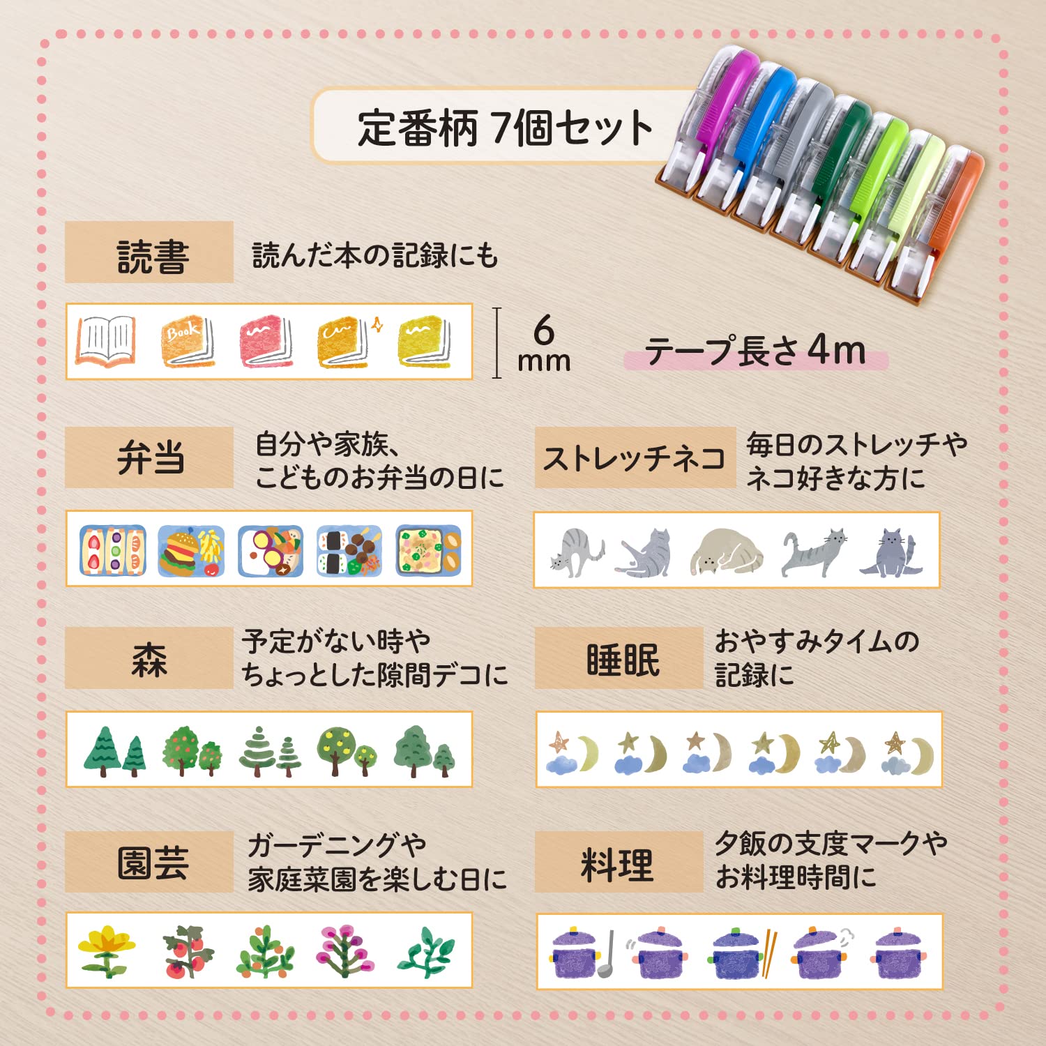 ①テープ幅6mmタイプ。(上下余白あり。印刷幅は4.8mm)バーチカル手帳等細かく記録、細部の隙間デコに最適! ②毎日の予定や日々の出来事行動の記録に最適なアイコン柄 新定番7柄。 ③予定変更や引き間違いにも心強い、専用消しゴム(別売り)で消せる ④簡単に長さを自由にコントロールできる!1個使いでワンポイントデコ、長く使えばラインデコに! ⑤テープだから、裏から書いても凸凹しない、手帳が分厚くならない、インクの裏抜けがない ⑥持ち運びに便利なコンパクトサイズ ⑦コレクション心をくすぐるカラーバリエーション、SNS映えする本体カラーで撮影小道具として活躍 ⑧品質もしっかり!ミニローラーヘッド、ワンタッチ開閉キャップ、スムーズトルク機構搭載