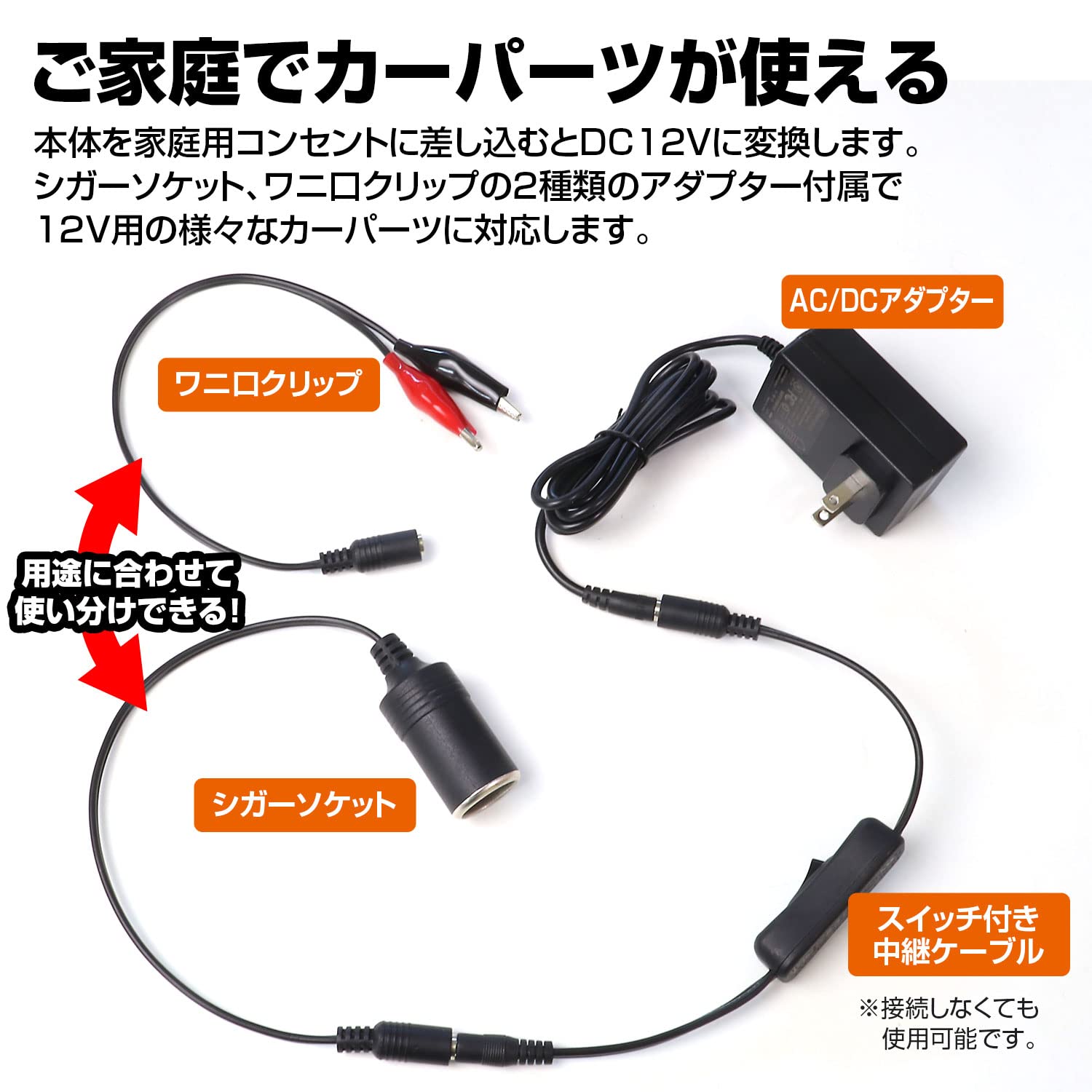 シガーソケット、ワニ口クリップの2種類のアダプター付属