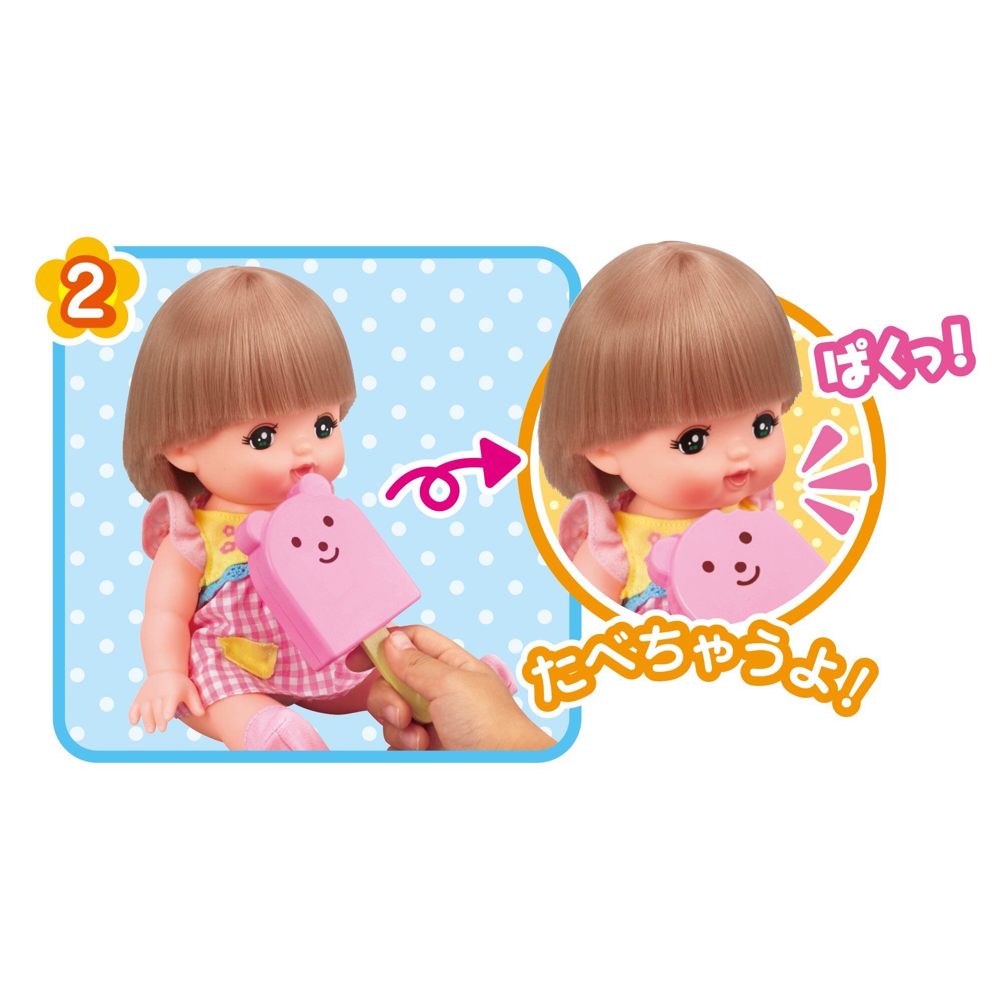 本当に食べたように見えるメルちゃんのかわいいアイス。箱から取り出して、耳の部分をメルちゃんに食べさせることができます。何度でも繰り返し遊べます。