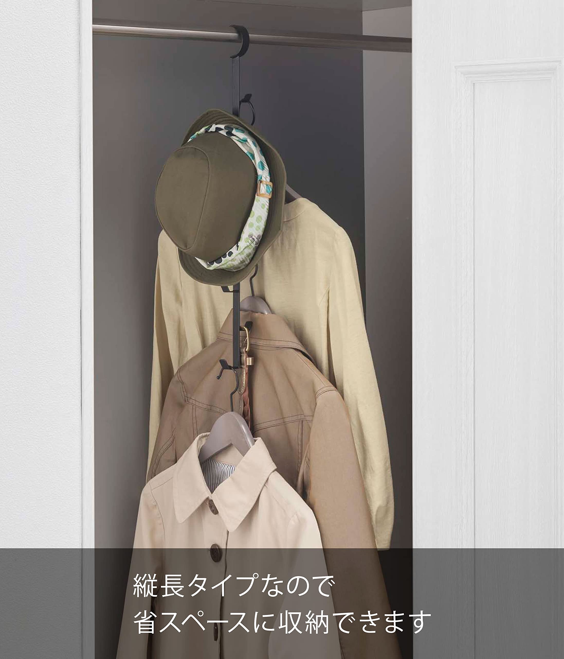 散らかりがちなバッグや帽子もクローゼットにまとめて収納。帽子・鞄・小物類をスリムに一括収納!クローゼットのパイプに掛けるだけの簡単設置です。縦に複数かけられるスリムタイプ。クローゼットにも馴染むスマートなデザインです。 ■サイズ:幅6×奥行5×高さ54cm■材質:本体/スチール(粉体塗装)■重量:230g■原産国:Made in China■備考:耐荷重/フック1つにつき約1kg