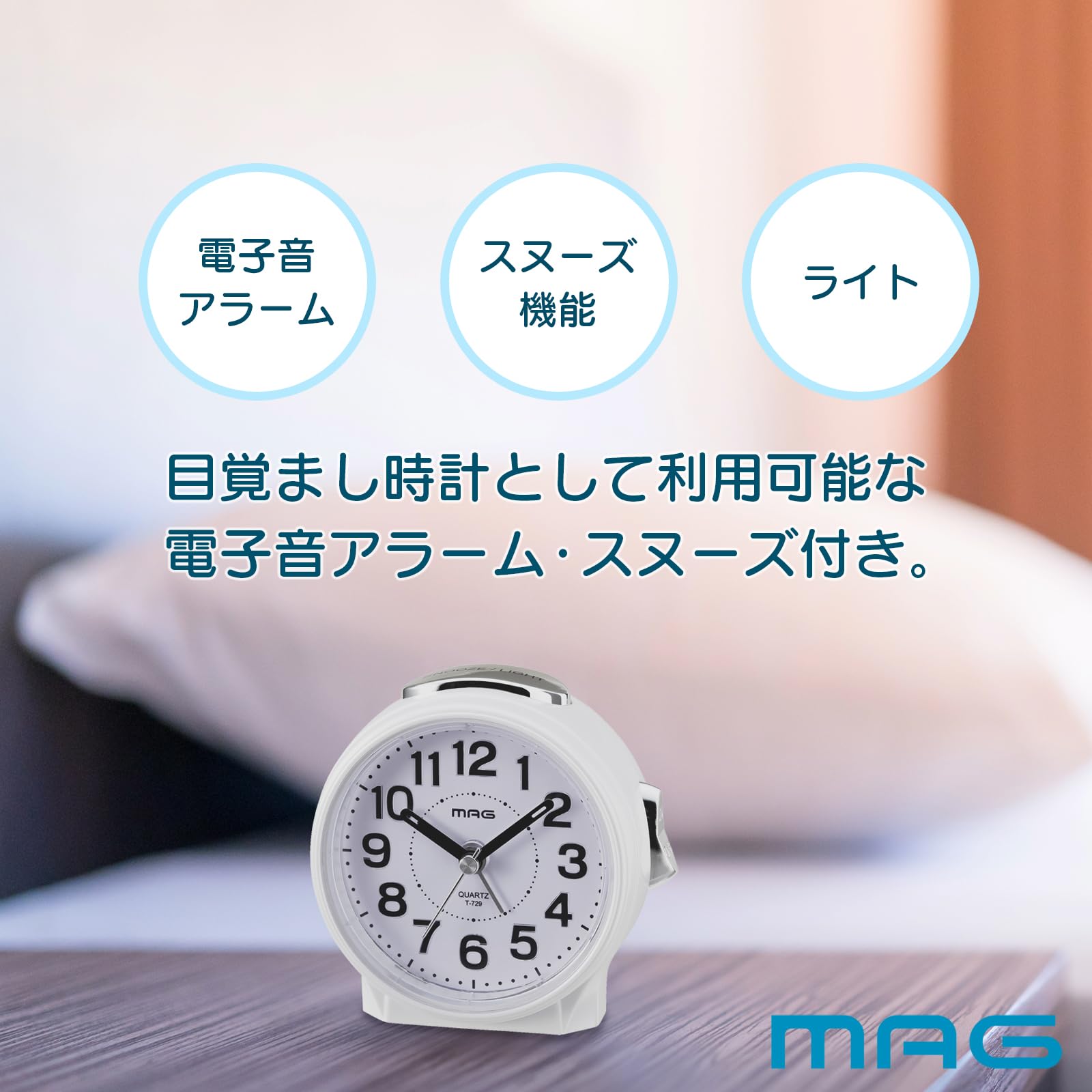 MAG(マグ) 目覚まし時計 置き時計 アナログ 静音 連続秒針 電子音 アラーム スヌーズ ライト ホワイト ブルーブライト T-729 WH-Z ノア精密