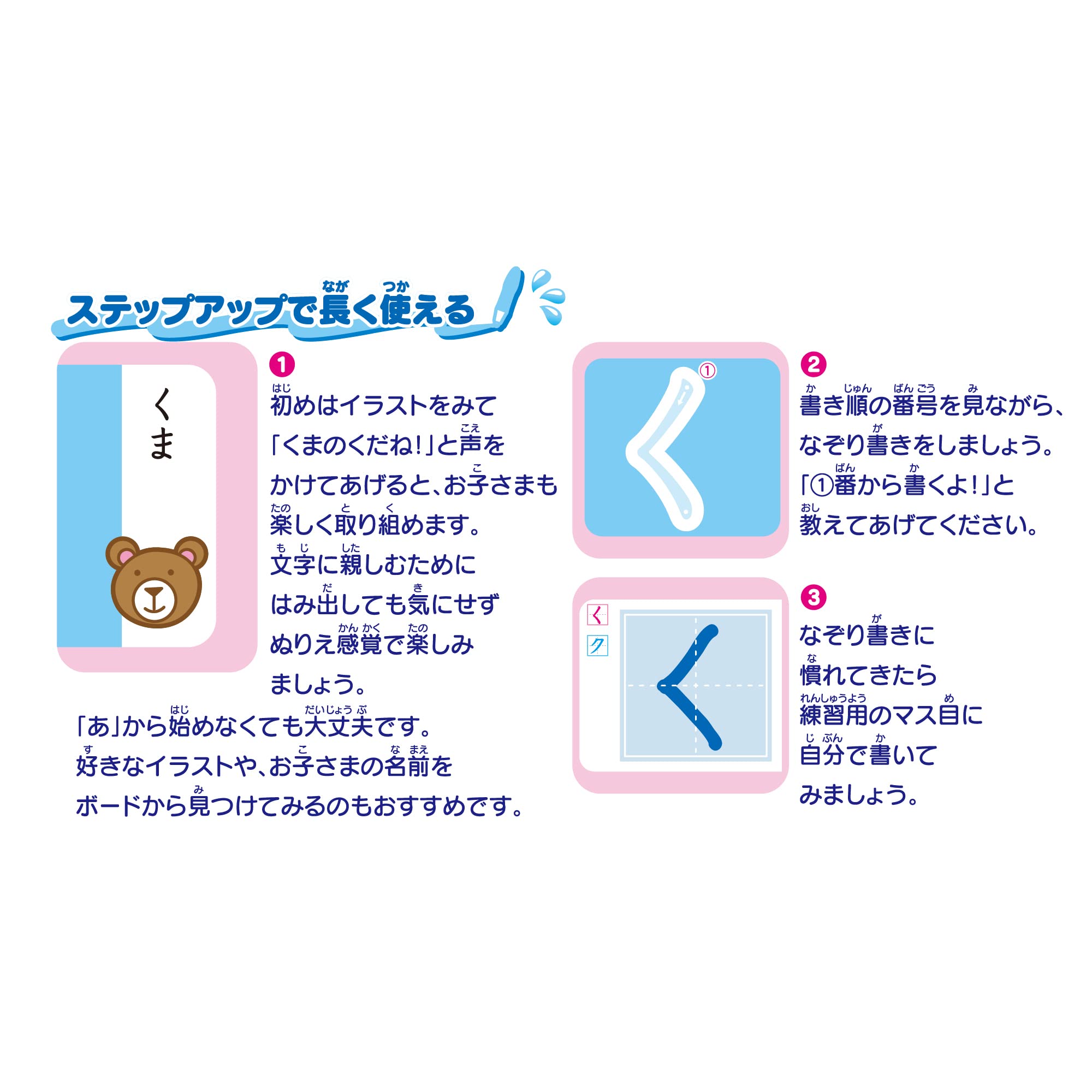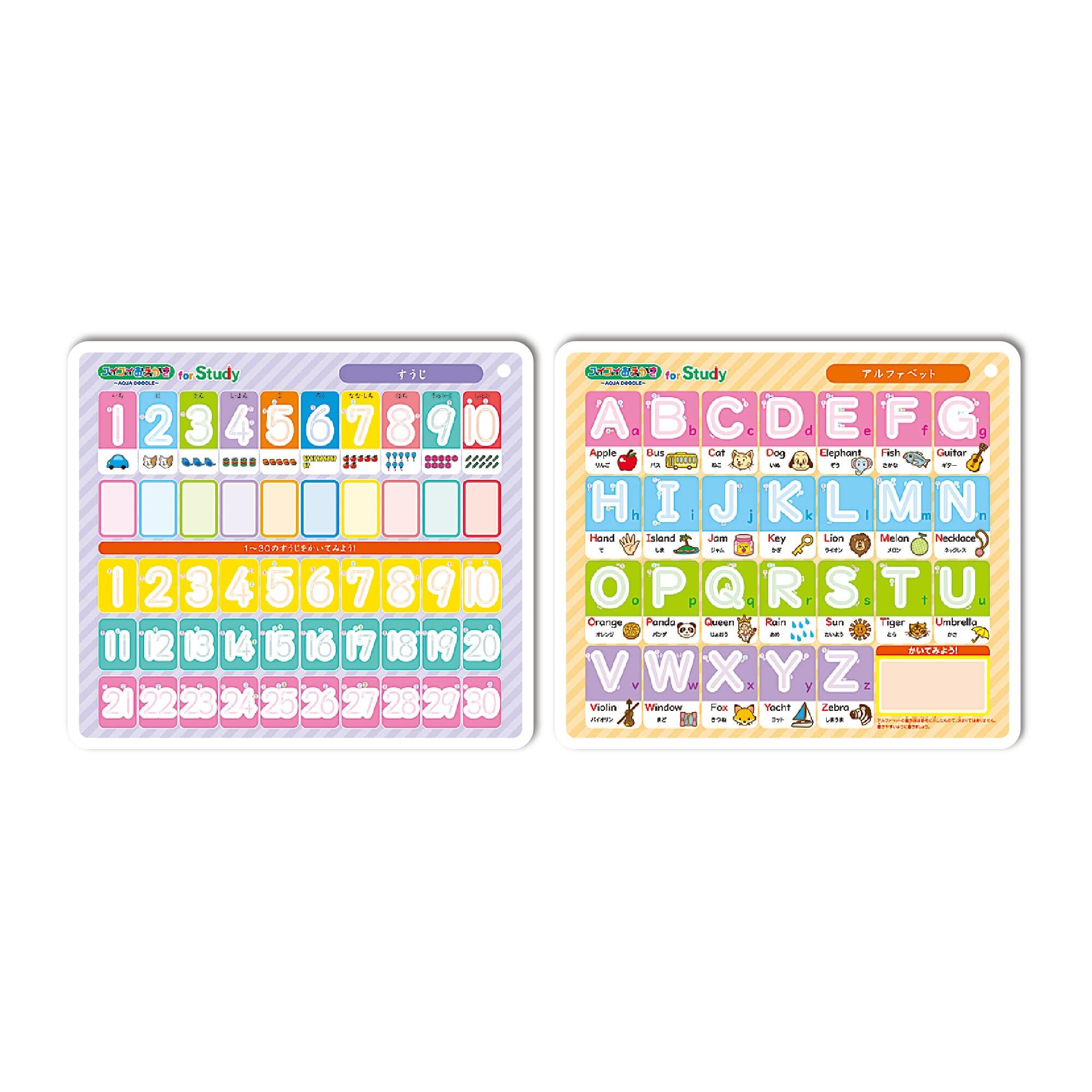 繰り返し書けて、楽しく文字書き練習ができるボード。<br>ひらがな、カタカナ、すうじ、ABCの練習ができます。<br>水で書くので汚れず、乾けば消えるので繰り返し練習できます。<br>人間工学に基づいた形状の専用細書きペン付き。
