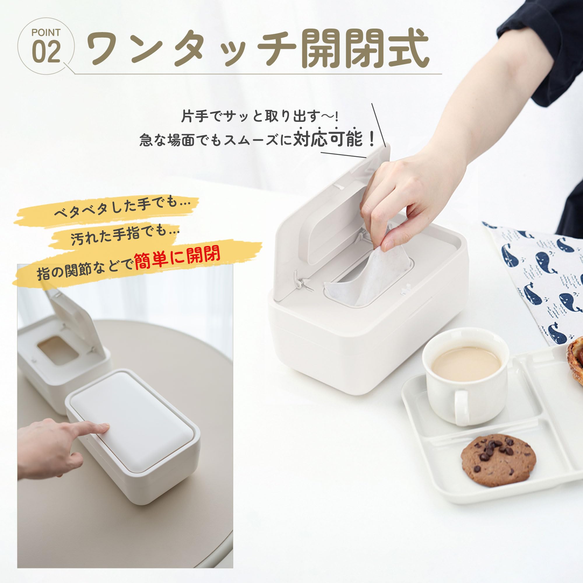 【ワンタッチ開閉式で便利】片手で簡単に操作が可能で、お子様のいる家庭や、片手がふさがっているシーンでもさっと取り出せるので便利です。ウェットシートケースやおしりふきケースとして日常的に使用する場合、特に忙しい朝や片手で手早く作業したいとき、すぐに使えるこのデザインが活躍します。