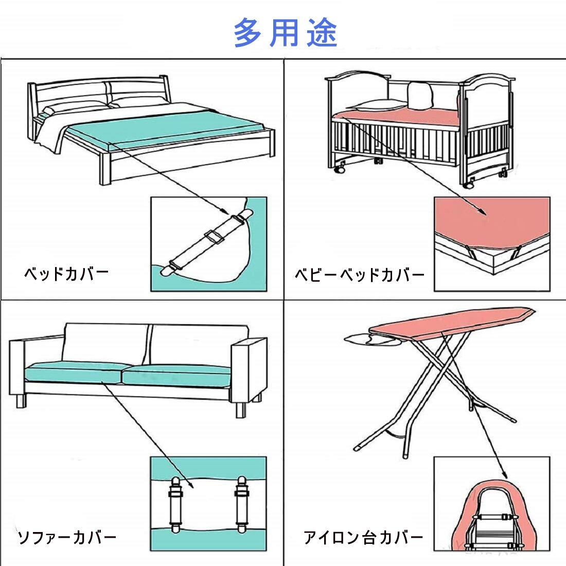 【用途】フラットシーツ、ソファーカバーロック、ソファー サスペンダー、敷パッド、ベッドカバ、マットレスカバー ソファーカバなどの端をクリップで挟むことで、シーツがズレないようになります