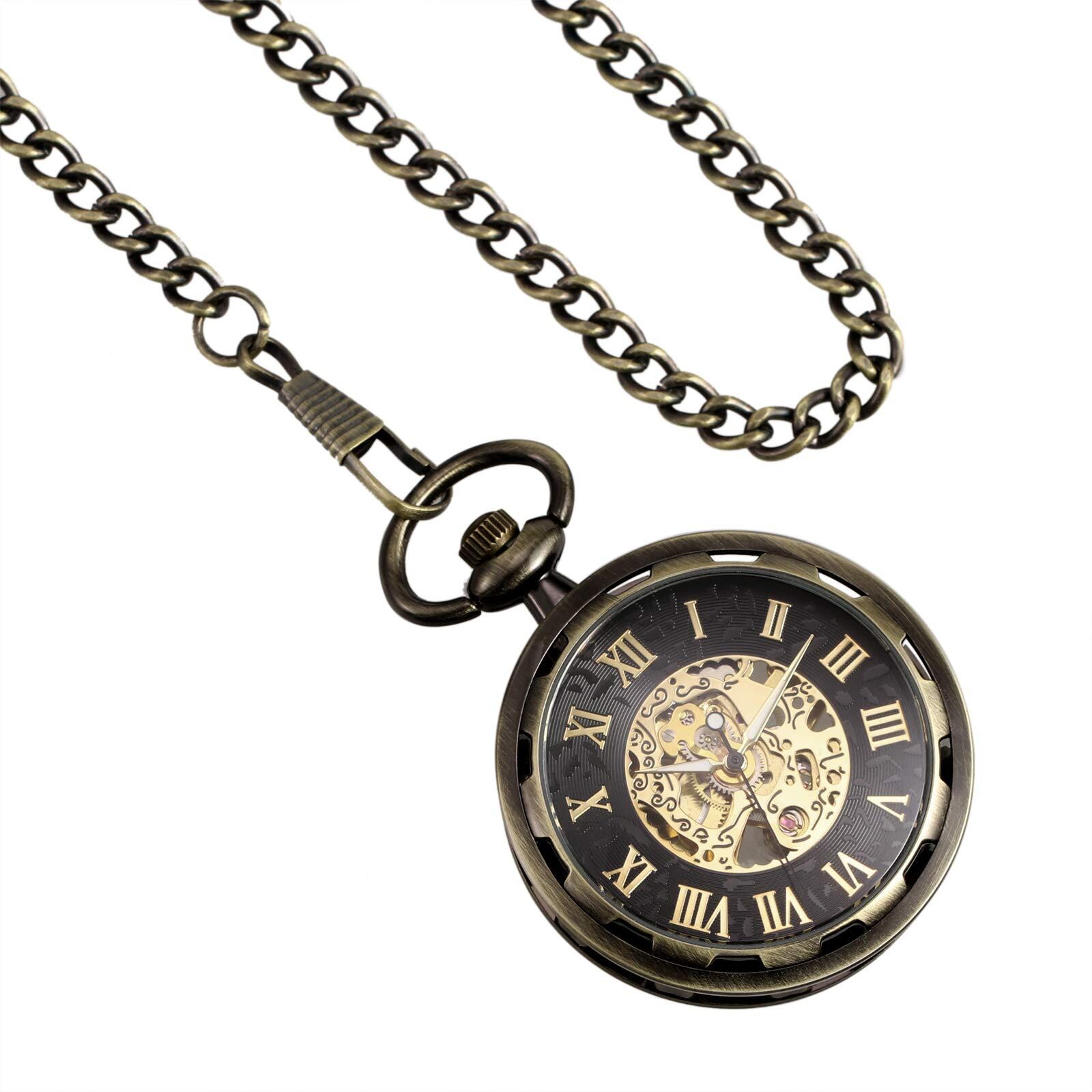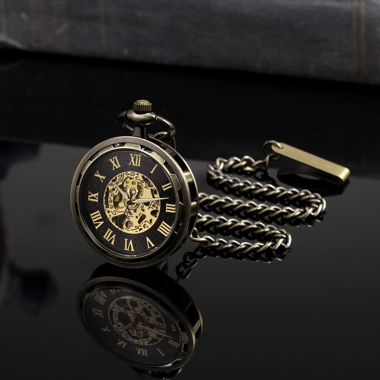TREEWETO 懐中時計 手巻き アンティーク 機械式 スケルトン メンズ チェーン付き (ブロンズ)