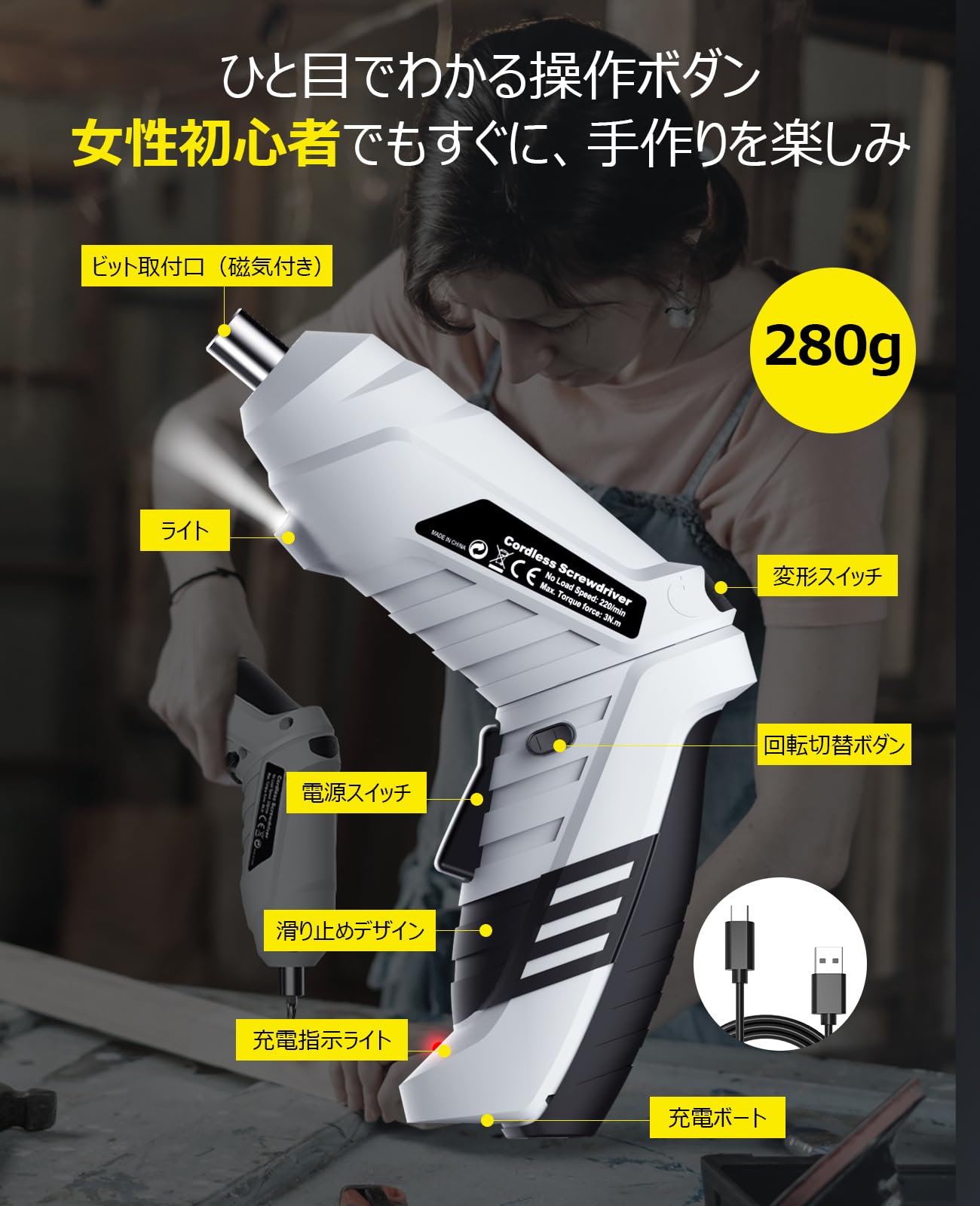 【コードレス式小型軽量・女性初心者向け電動ドリル】従来品より小型、軽量化されて使いやすさが高めて、わずか280gの重量で疲労や不快感を感じることなく長時間の作業を可能にします。付属したケースは頑丈な作りになって、取っ手があるので収納や持ち運ぶこともできます。小型・軽量ながら十分なパワーがあって、一目瞭然の操作性は大工やリフォーム業者などのプロだけでなく、工具初心者や女性にもオススメ。