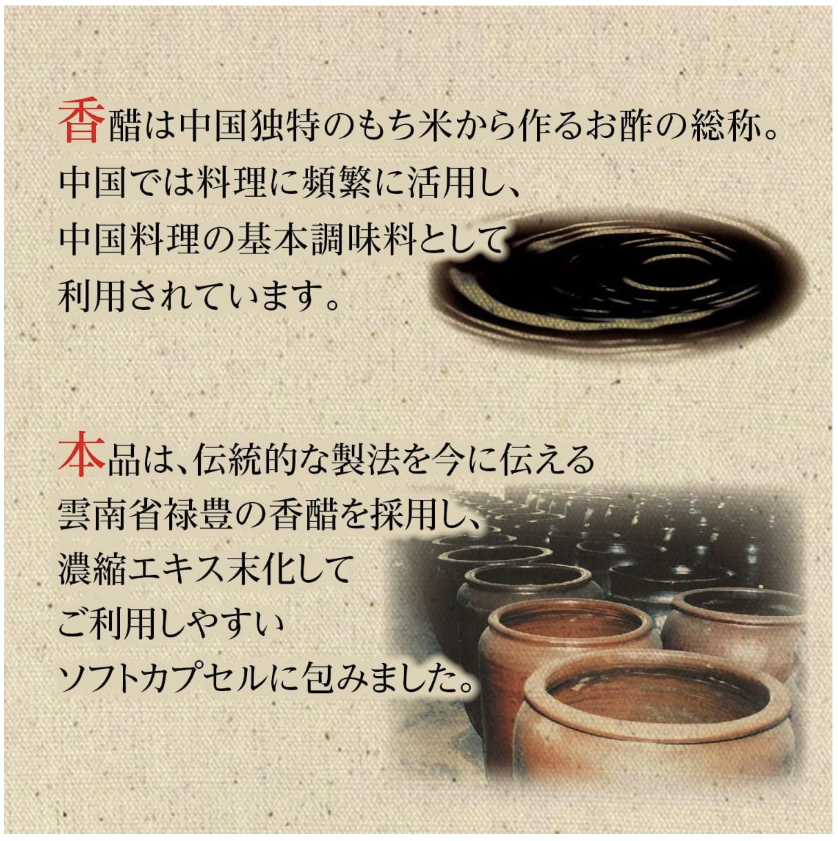 香醋は中国独特のもち米から作るお酢の総称です。中国では、香醋を料理に頻繁に活用し、中国料理の基本調味料として利用されています。香醋にはアミノ酸が国産の黒酢とくらべ約10倍も多く含まれています。(当社比)本品は、伝統的な製法を今に伝える雲南省禄豊の香醋を採用し、濃縮エキス末化して使いやすいソフトカプセルに包みました。ご家族皆様の毎日の美容と健康にお役立てください。