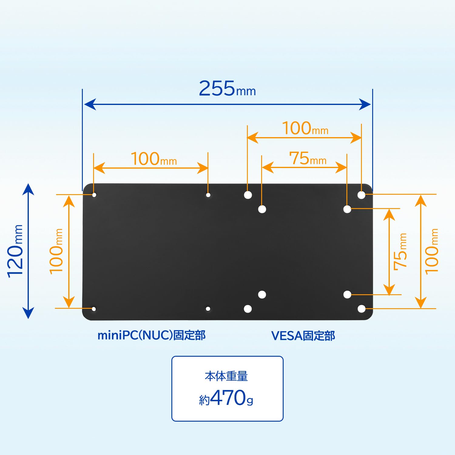 GP-VMPI/Bは、miniPC(NUC)を液晶ディスプレイのVESAに固定できるアダプターです。既存のディスプレイアームに干渉せず、miniPC(NUC)を固定することができます。多種のスペーサーとネジを同梱しており、VESAが凹んでいる液晶ディスプレイにも対応しています(凹みは最大10mmまで対応)。
