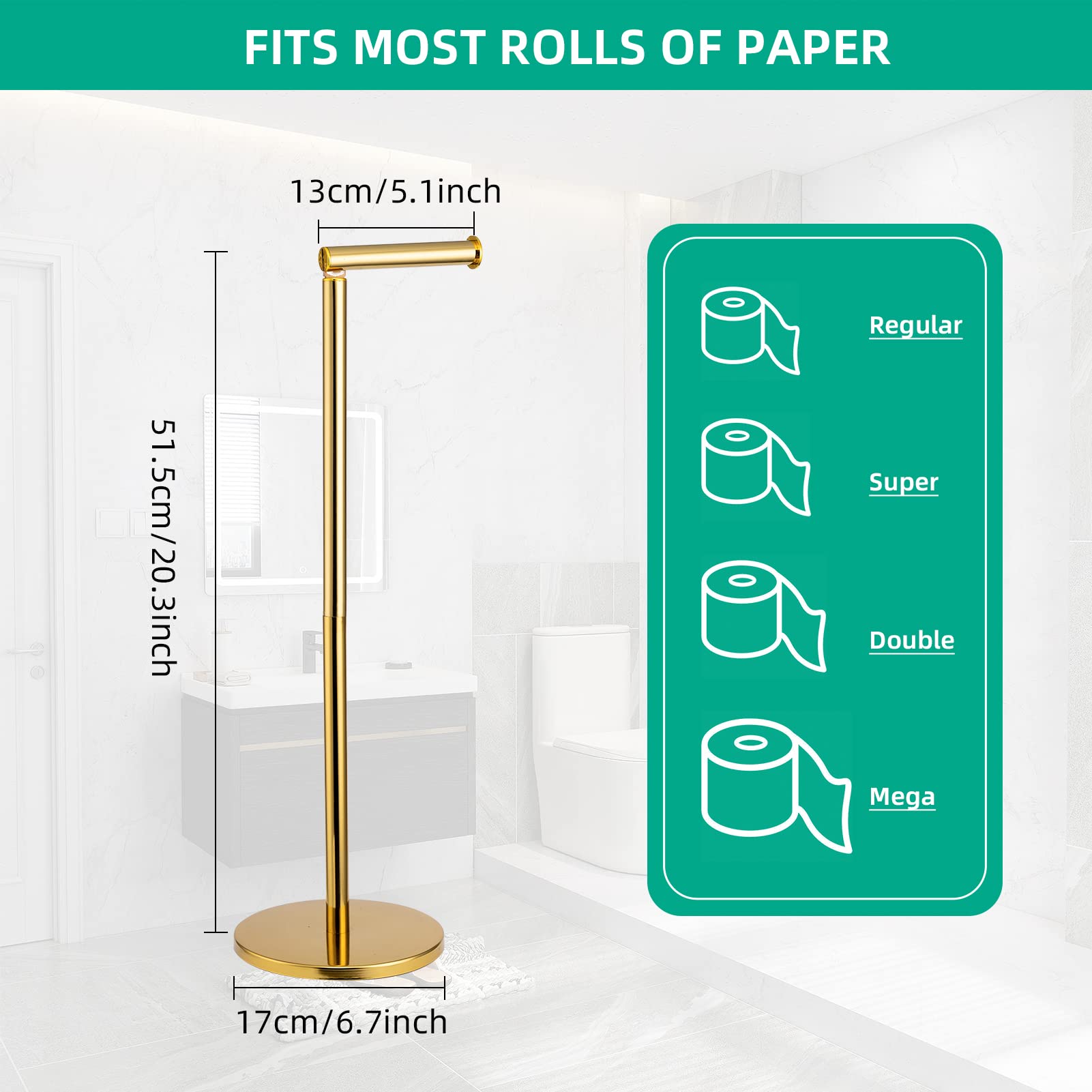 ほとんどのロール紙にフィットします - このトイレットペーパーロールホルダーは高さ21.65インチ/55cmで、高い位置で、トイレットペーパーを簡単に取り出せます。 ローラーアームの長さは5.9インチ/15cmで、レギュラー、メガ、ジャンボなどのほとんどの家庭用サイズのロールにフィットします。 ラウンドベースは直径6.3インチ/16cmで、頑丈で安定性があります。
