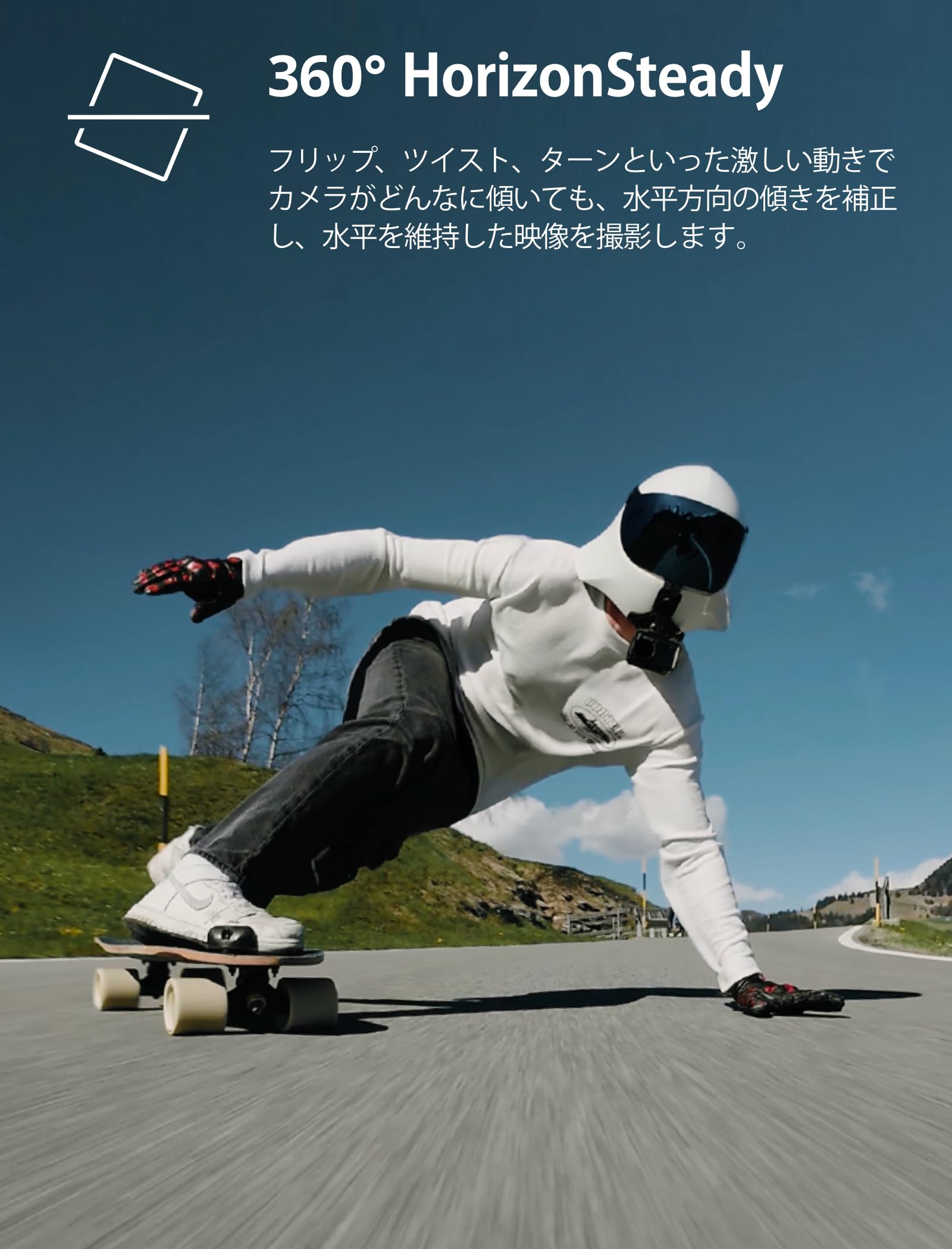 [360º HorizonSteady] - カメラが360°回転しても、安定した映像を撮り続けられるパワフルな映像ブレ補正機能を搭載。3種類の映像ブレ補正モードから選べ、激しい動きをしている間も、滑らかな映像を撮影します。