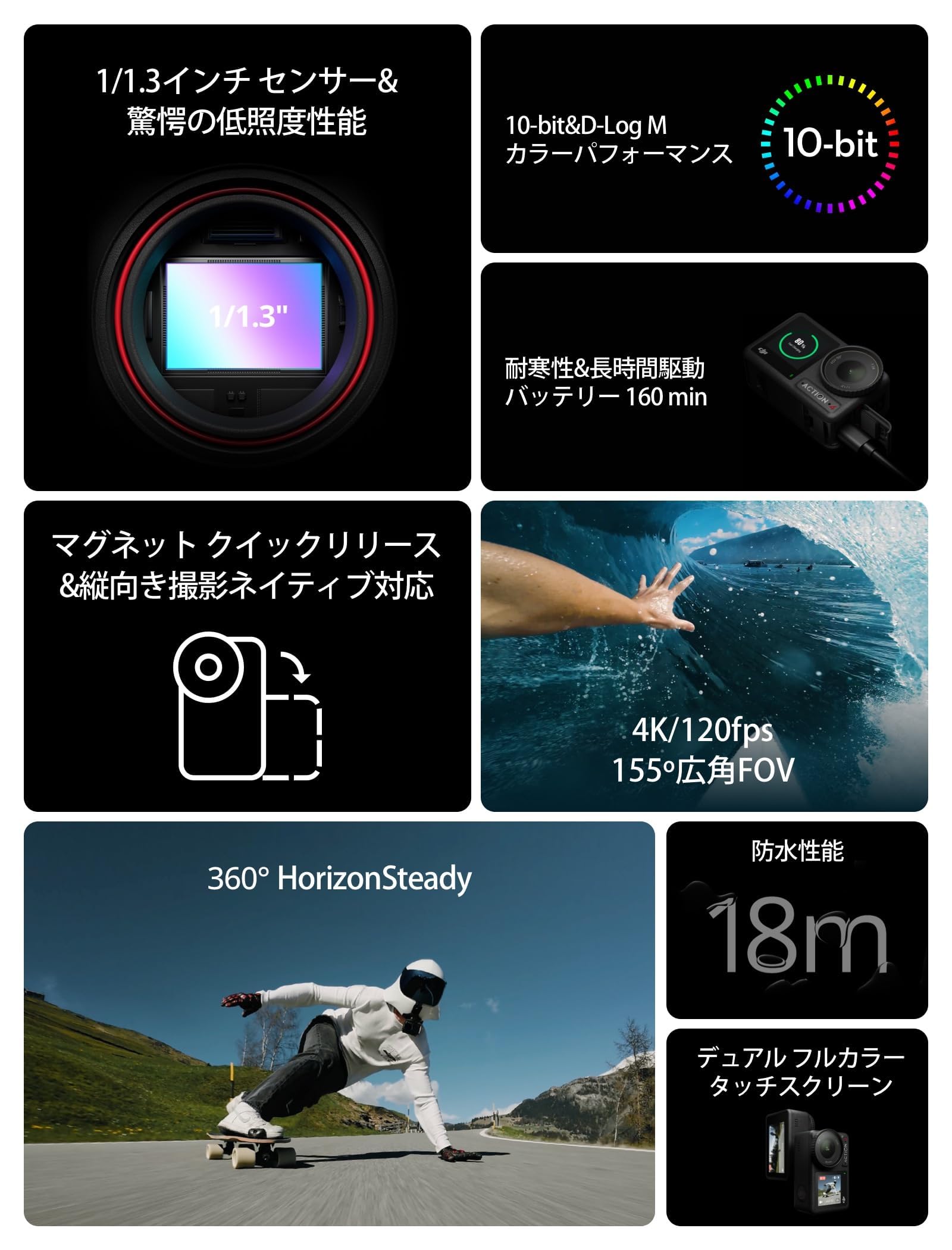 [4K/120fps & 155º 超広角FOV ]- スポーツシーンも、4Kの高解像度と広角FOVで撮影でき、一人称視点の迫力ある映像を撮影します。鮮明なスローモーション映像でスポーツシーンを捉えましょう。