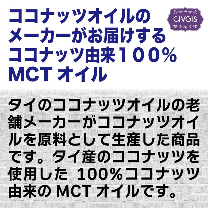 【ココナッツ由来100%】低温圧搾=コールドプレスした無添加のココナッツオイルを原料として、ココナッツオイルに含まれている中鎖脂肪酸のうちのカプリル酸とカプリン酸を取り出したオイルです。製造工程は化学溶剤などを一切使用せず、蒸留法にて分留しています。化学的な精製は行なっておりません。