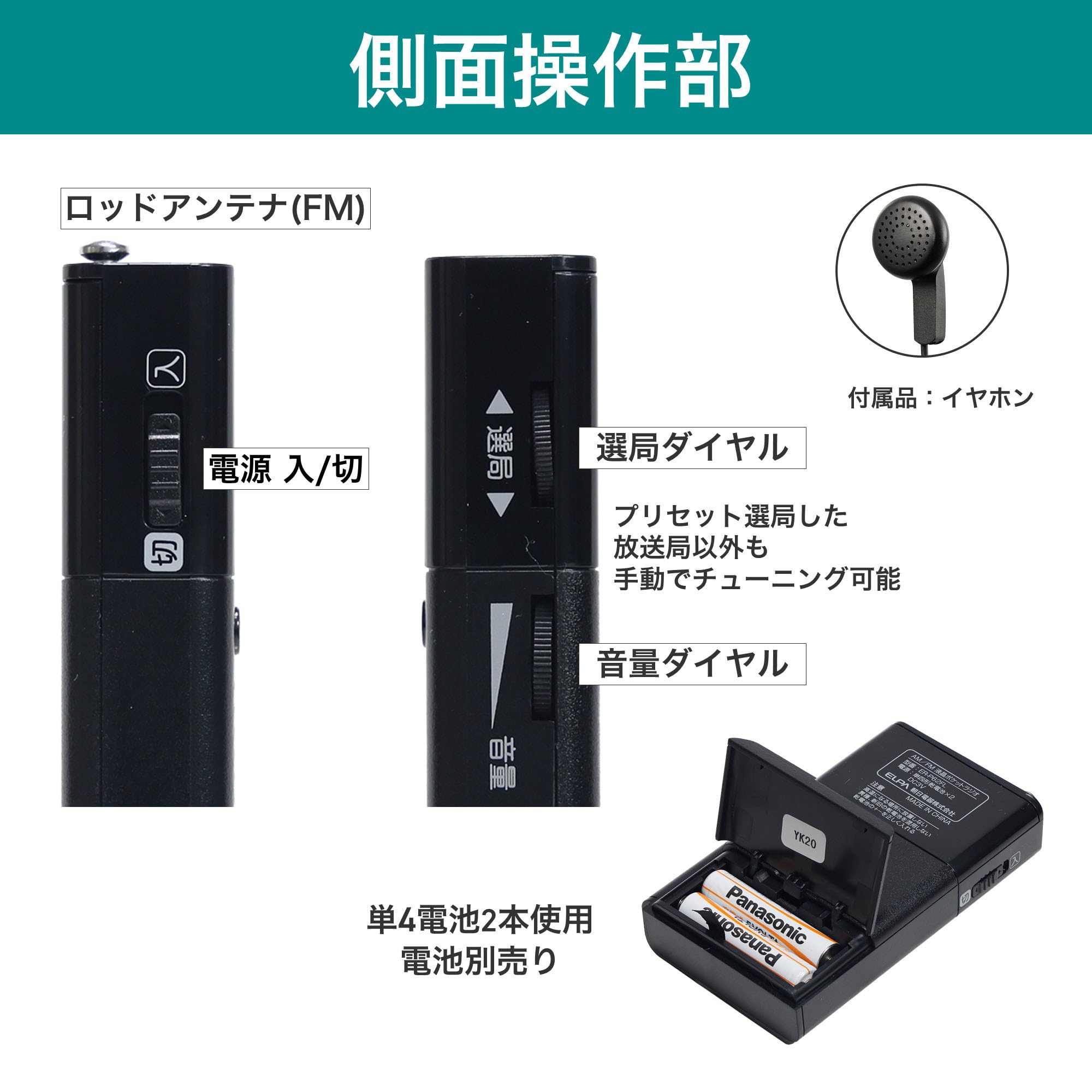 ■同調方式:デジタル同調 ■受信周波数:AM:522~1620kHz FM:76~95MHz ■スピーカー:直径40mm 丸型16Ω ■出力端子:φ3.5mmミニジャック ■電源:DC3V 単四形乾電池×2本(別売) ■外形寸法(約):幅55×高さ102×奥行20(mm)(最大値) ■質量:約77g(イヤホン・電池除く) ■付属品:イヤホン ■電池持続時間(JEITA) ※アルカリ乾電池使用時 ※電池の性能、使用条件により電池持続時間は短くなる場合があります。 スピーカー使用時:AM…約16時間 FM…約16時間 イヤホン使用時(目安):AM…約28時間 FM…約28時間