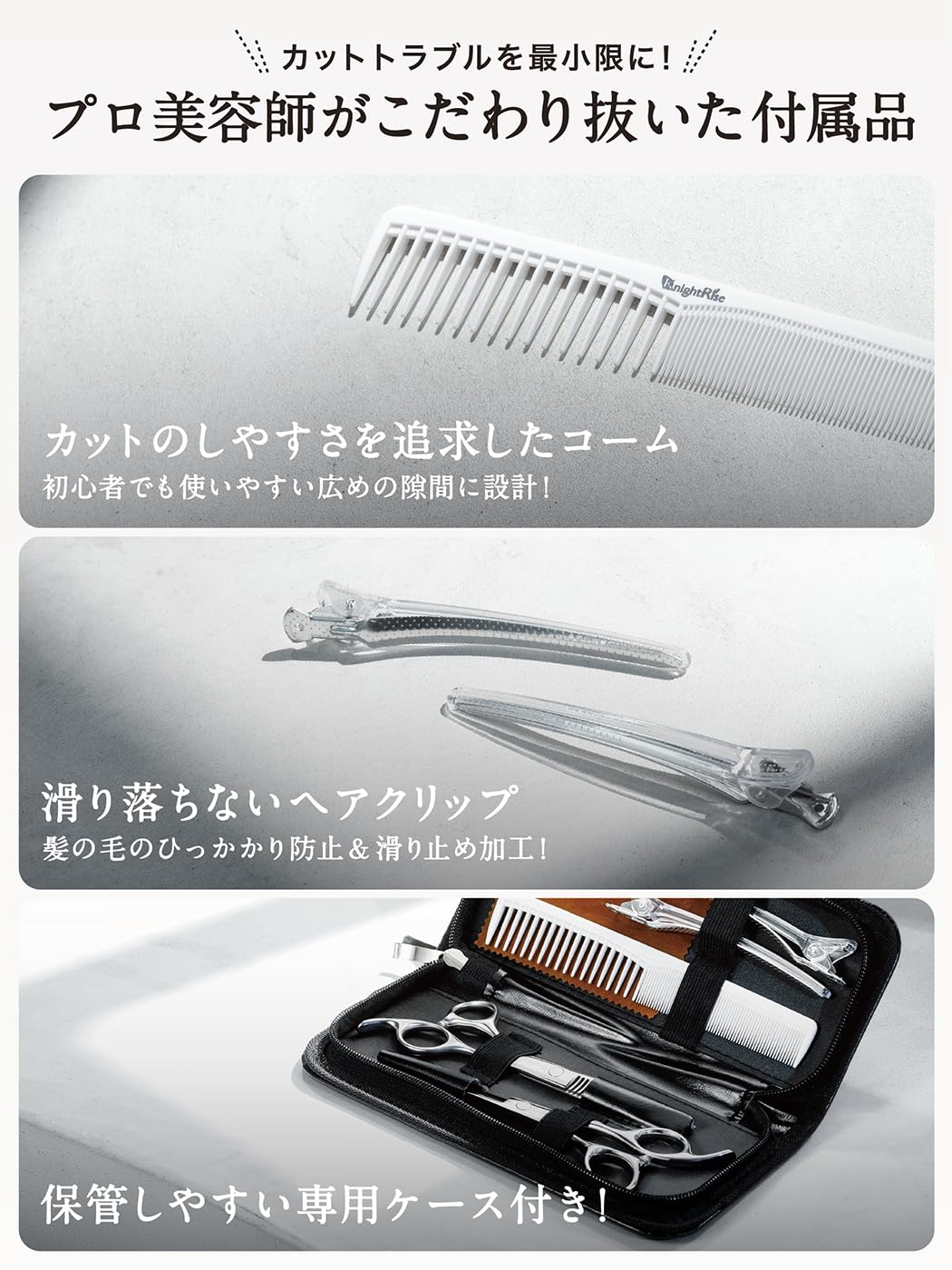 【プロ美容師が徹底監修】 ナイトライズのシザーセットはプロ美容師との共同開発により、握りやすさや刃の形状、重心バランスまで細部にこだわり、コーム、ヘアクリップ、シザーケースなどセット内容全てに最適な道具を揃えました。細かい改良を繰り返して完成したこだわりのセット内容になっております。