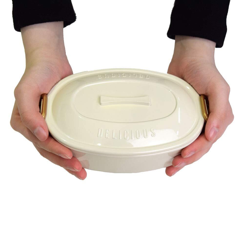 トレンド家電のようなフォルムとしっかり安心で簡単なバックルがポイントの1段ランチボックス。映え弁当にもぴったり。安心のパッキン、つめるのに嬉しい仕切り付き。