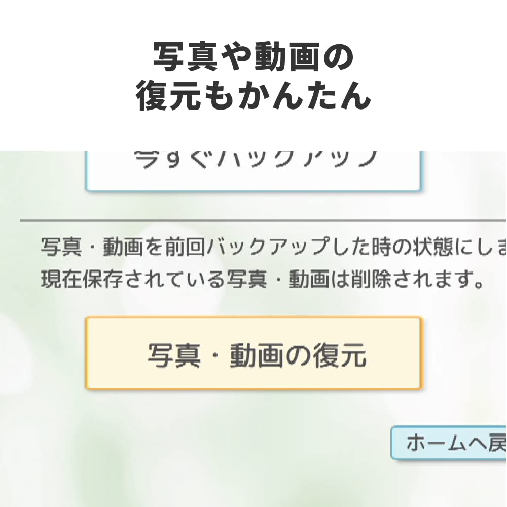 【バックアップは自動で】曜日や時間を設定したら、あとは「おもいでばこ」が自動でバックアップ。電源を切ることなく、定期的なバックアップが可能に。 ※本体ファームウェアVer.7.10 以降で対応