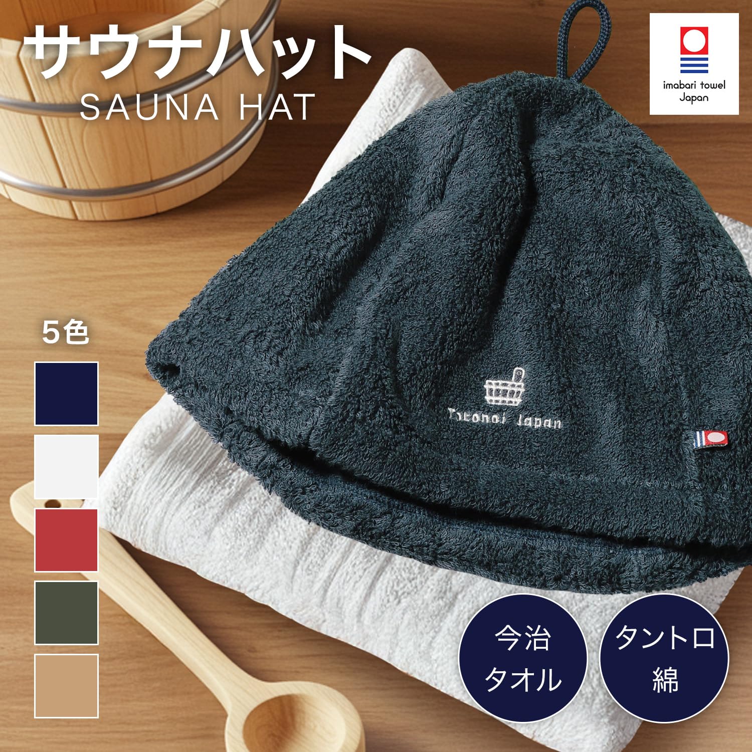 今治タオルのメーカーがサウナを愛する人のために作ったサウナハットです。 手軽に使ってもらえるよう、洗濯機でも簡単に洗ってもらえ、しかも、頭の上部分にはループつきで、乾かす時の利便性も考えています。 今治タオルのロゴマークのタグと、「Totonoi Japan」の文字、ワンポイントのマークが入っています。 メンズ、レディースの区別がないので、男性も女性も使っていただけ、プレゼントにも最適。色もネイビー、ボルドー、ホワイト、カーキ、キャメルから選べるので、好きな色を使っていただけます。