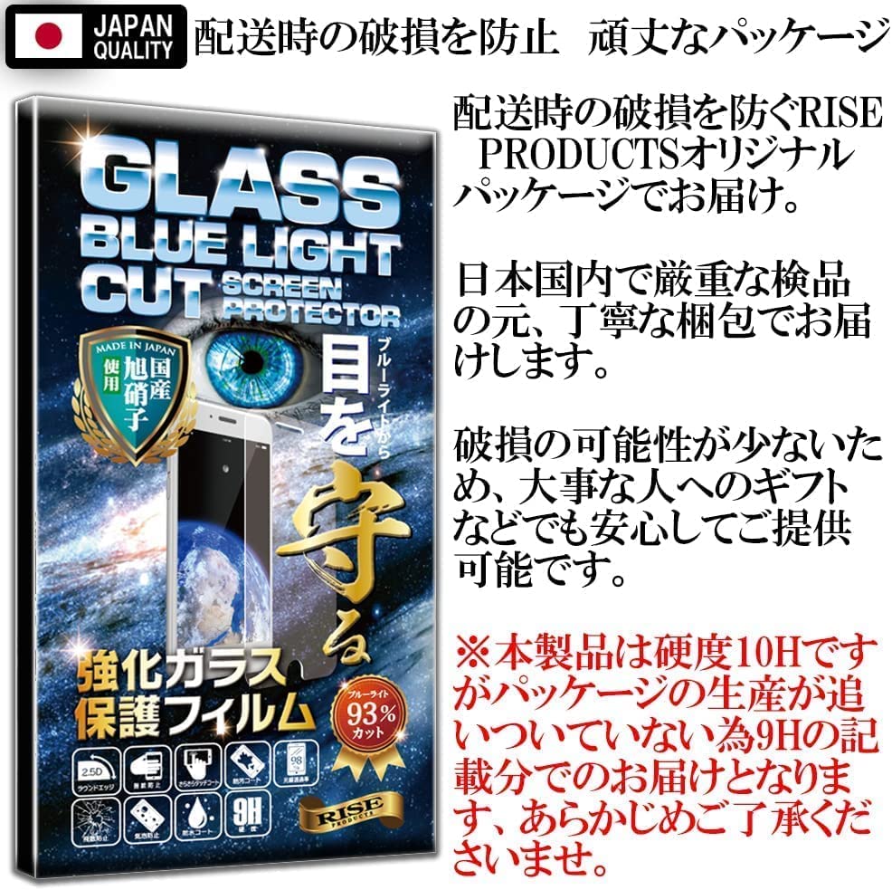 国産旭硝子素材を使用、ブルーライト93%カット、※400nmのブルーライトについては最大97.2%のカット率となります、平均化して93%での記載をしております。高透明度98% 硬度10H 極薄0.33mm 2.5Dラウンドエッジ仕様 指紋防止 防汚コート 飛散防止処理済 強化ガラス保護フィルム ガラスフィルム×1、ウェットクロス×1、ドライクロス×1、ホコリ吸着シート×1、貼付説明書付属。