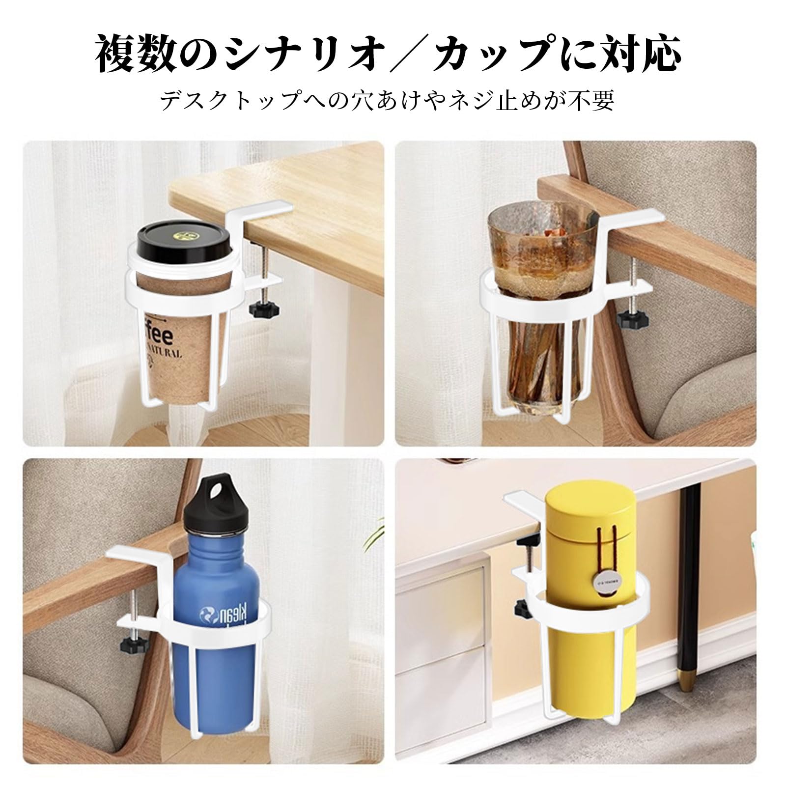 ドリンクホルダー デスク ドリンクホルダー 机 デスク ドリンクホルダー 机の下に収納できる カップホルダー デスク クランプ式 取り付け簡単 金属製 スペース節約 テーブル収納 内径10cm(ホワイト)