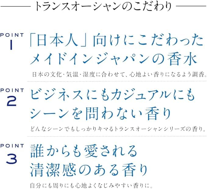 ■RISINGWAVE ライジングウェーブ 好感。共感。清潔感。自分も周りも心地よく。 新しい時代の香りを追い求める人気の香りブランド。 ■【トランスオーシャンシリーズ】 ダイバーズウオッチの「トランスオーシャン」がもつ、本格ダイバーズウオッチとしてのスペックと、 ビジネスシーンにもフィットするデザイン性を両立する「二律背反」というコンセプトを共通のテーマにした、 休日に海辺を歩くようにゆったりとしたときも、ビジネスシーンで身を引き締めるときも似合う香りのシリーズです。 ■CONCEPT 煌めく輝きを放つ都会の中でも、壮大な海を前にしても、纏う香りはただ一つ。 その香りは、二つの世界を自在に行き来する男に確かな自信を与える。 繊細でありながら、同時に力強さも持ち合わせる男のための香り。 ■ 【DESIGN①ボトルカラーリング】 透き通るような青のグラデーションは、海の深さを表現しており、 ダイバーが海へ潜っていく瞬間の海中の世界を表現している。 ■ 【DESIGN②パッケージデザイン】 太陽の光がキラキラ海の中へ透き通る情景、透明度が高い海の色をイメージ。 この色は、何度も何度も試作を重ねて出したこだわりのブルーカラ―。 妥協しない男達の為に作られた特別な色。 両サイドのプレートは、鏡と同じ作り方で製造された非常に輝度の高い素材を採用。 ■FRAGRANCE 穏やかな水が奏でる柔らかな光の音色。 あたり一面を輝かせ、世界を新しくまっさらに。 優しく包み込むガルバナムグリーンの香りがタフな男の色気を演出する。 透明感のあるミュゲを加え、この上なくみずみずしいフルーティーマリンノート。 ■【香調:フルーティーマリンノート】 TOP:アップル、ピーチ、ベルガモット、ガルバナムグリーン MIDDLE:ローズ、ミュゲ、ラズベリー LAST:ホワイトムスク、サンダルウッド、アンバー ■【香り長続き】 爽やかな香り立ちをより長く楽しむために開発された処方である、 「キープアロマテクノロジー」を採用。 濃縮された残香性香料を配合することにより、 香りを長く維持することを可能に。