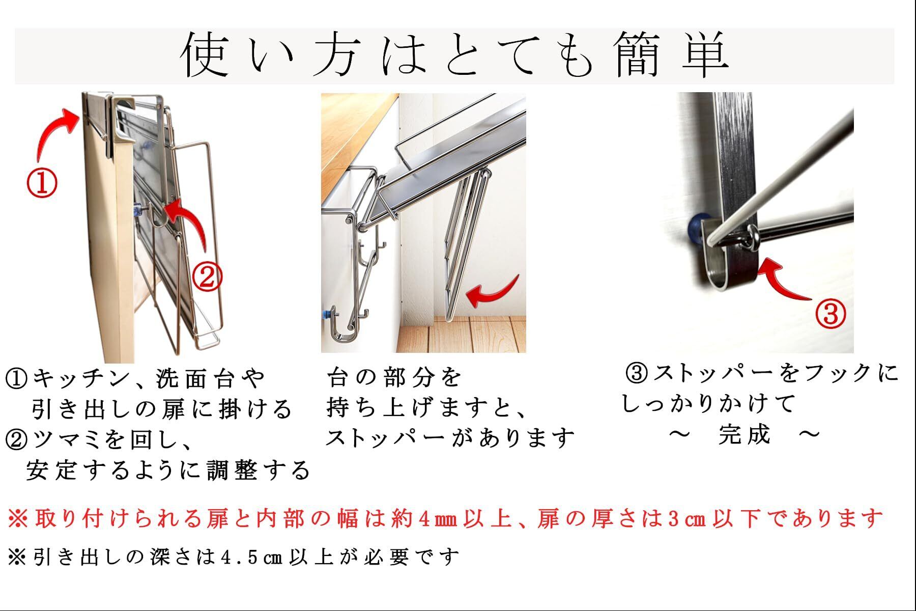 補助テーブルは、とびらや、引き出しに掛けるだけですぐに使用可能です、使用しない時、折り畳んで収納や外して収納も簡単に行えます。