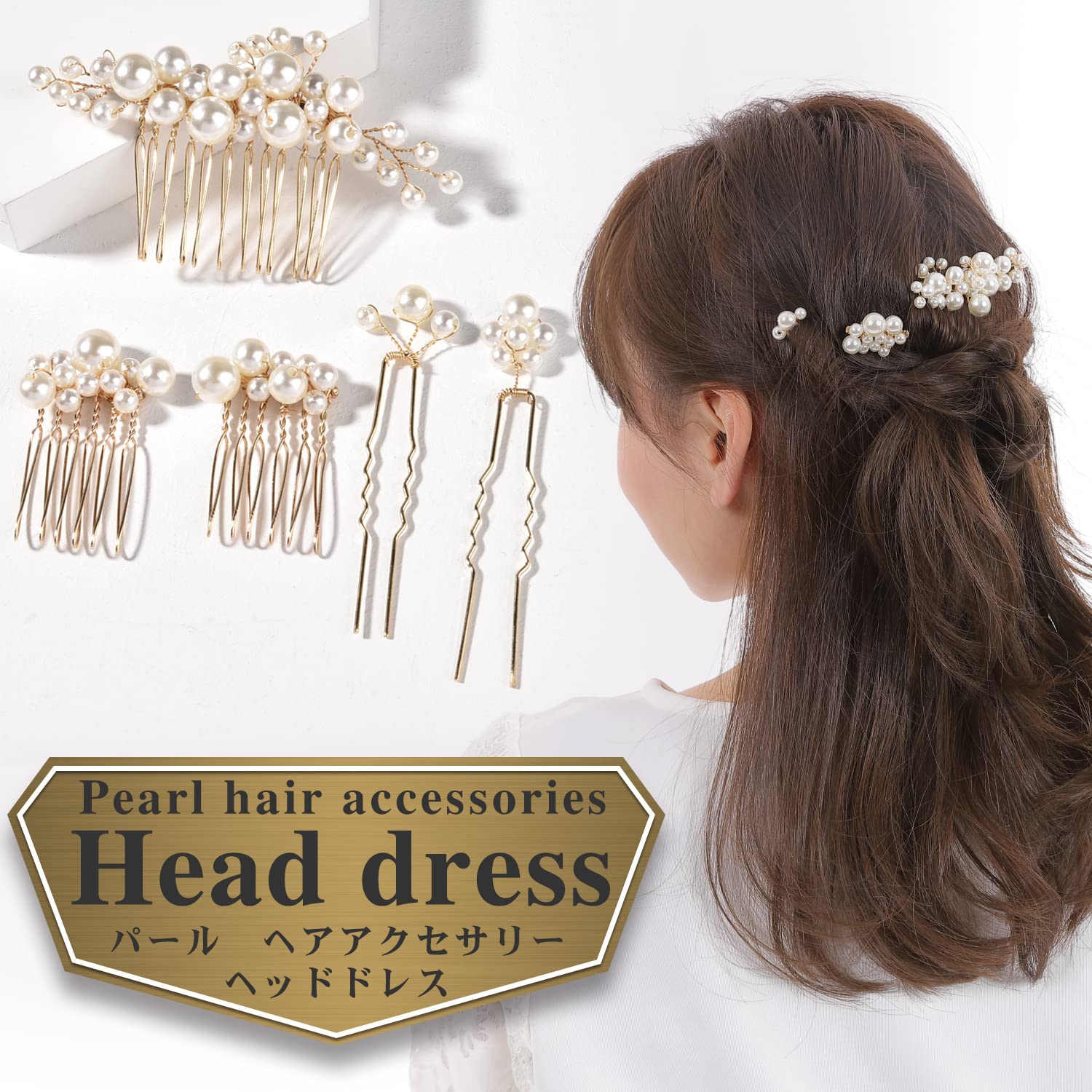 【ヘアアクセサリーに最適】ゴールドの土台にパールを装飾した高級感のあるアクセサリー。5点セットで髪を留めながらもサイズ違いのパールを散りばめれます。