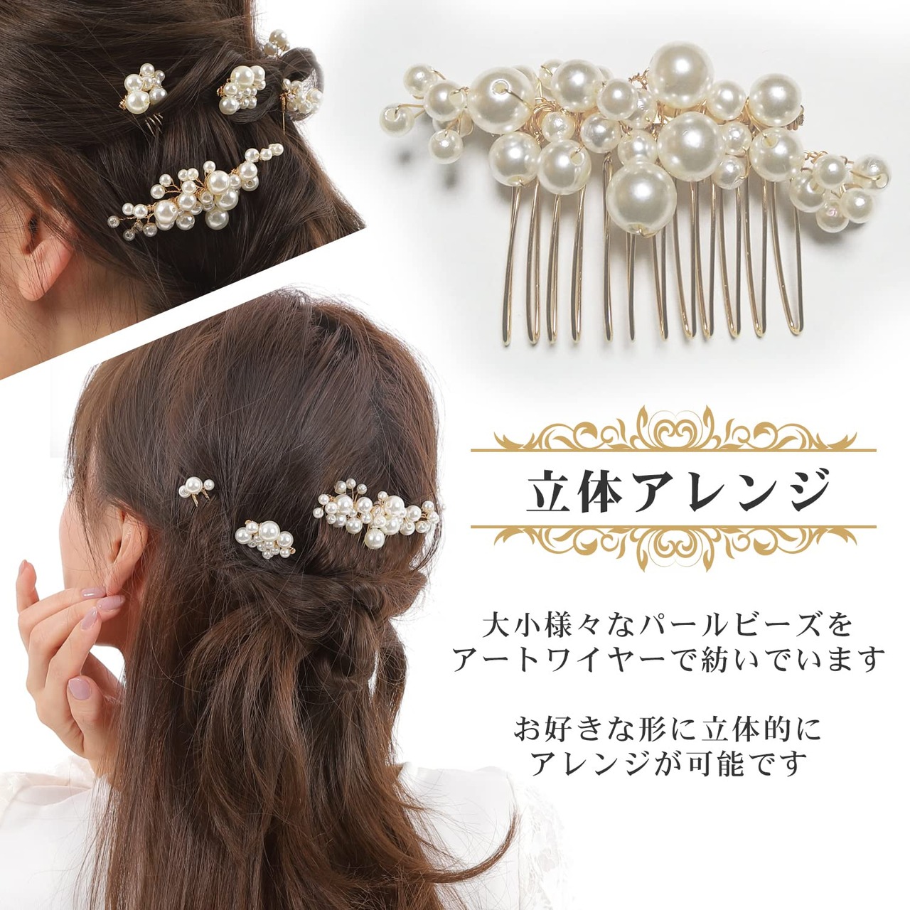 【5バリエーションセット】大小様々なコーム5点セットです。色々な角度からしっかり髪をまとめて各所にパールがアクセントに。お好きな形に立体的なヘアアレンジが可能。