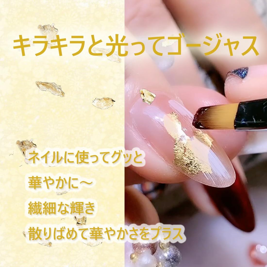 細かく砕かれた工芸用の金箔です。いくつかの種類や粗さを組み合わせることで、いろいろな表情を持たせることができ、見事な光沢のあるテクスチャ効果を作成して、キラキラ感もUP! この髪用金箔シートは薄く、忍耐強く熟練する必要があります。