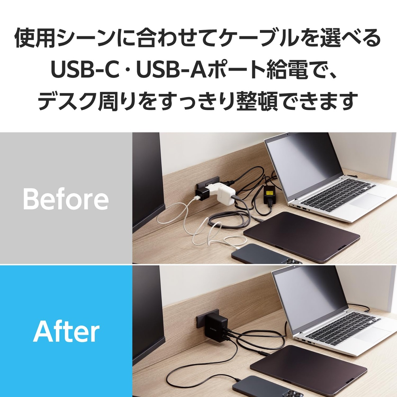 ノートパソコン付属のACアダプターと違い必要な長さのケーブルを選んで使えるから、長すぎるケーブルでごちゃつきがちなデスク周りもこれですっきり。スペースを広々使えます。