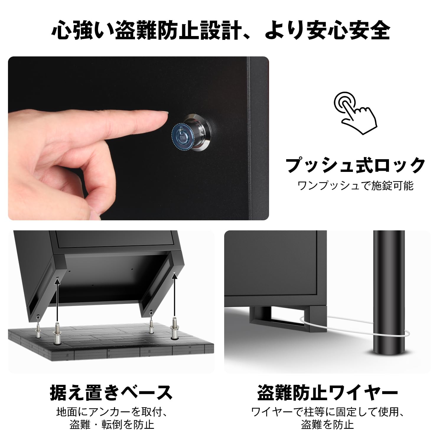 【操作簡単】郵便受け付きの宅配ボックスは組み立て不要で届いてすぐに使用でき、必要に応じてアンカーセットとワイヤーを取り付け、盗難を防止します。雑誌、郵便物などの小型郵便物はメールボックスから投函可能で、下側のメイン扉は大きめの荷物を受け取れるスペースを確保できます。さらに、案内用のマグネットシート付きで、配達員が見やすいところに貼り付ければ、投函方法が一目瞭然、配達作業もスムーズに行われます。